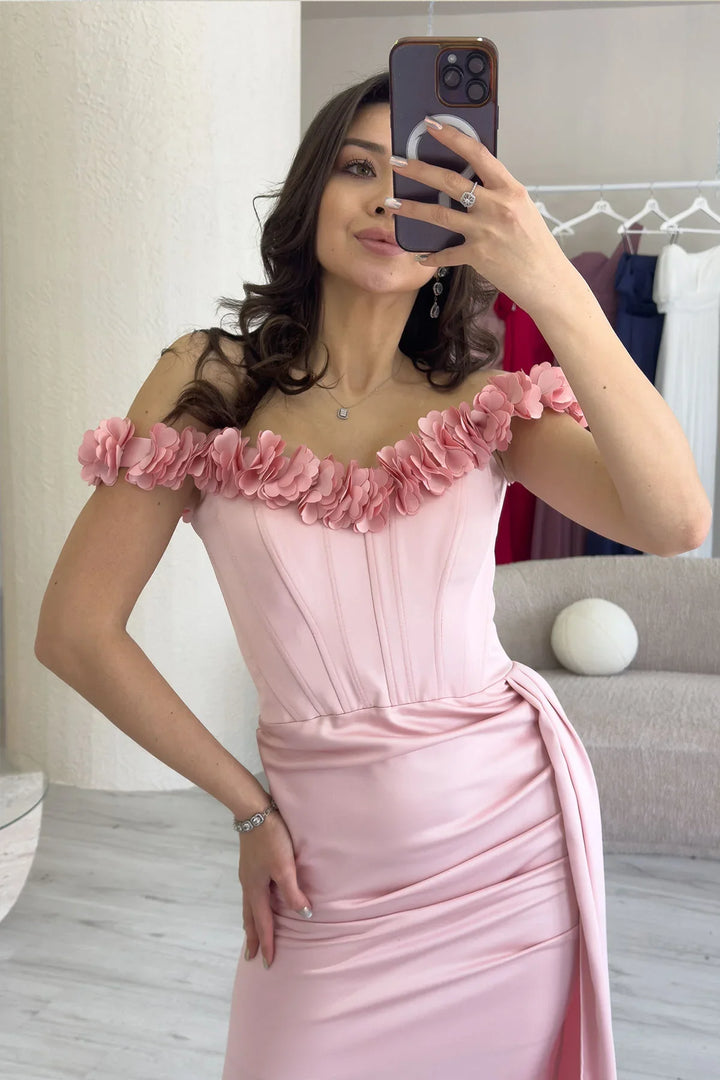Pudra Çiçekli Kayık Yaka Drapeli Yırtmaçlı Saten Abiye Elbise