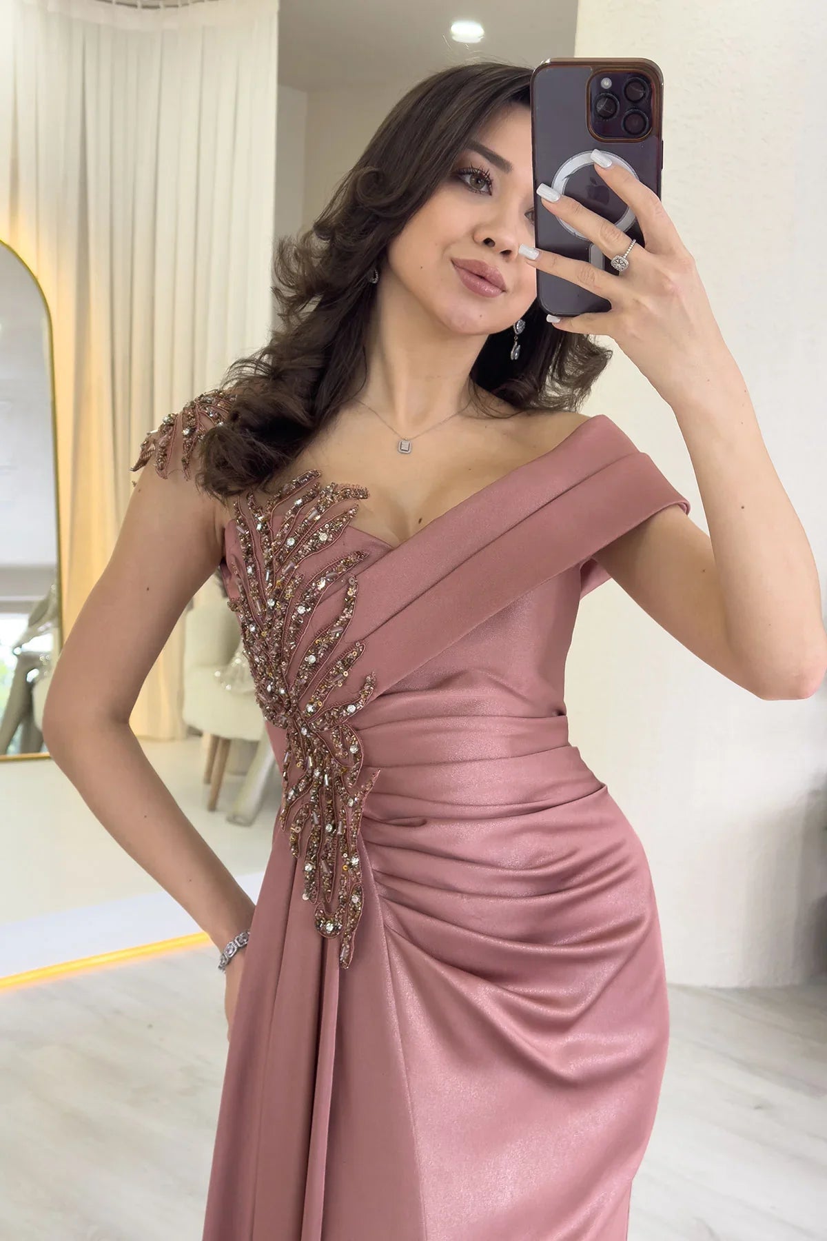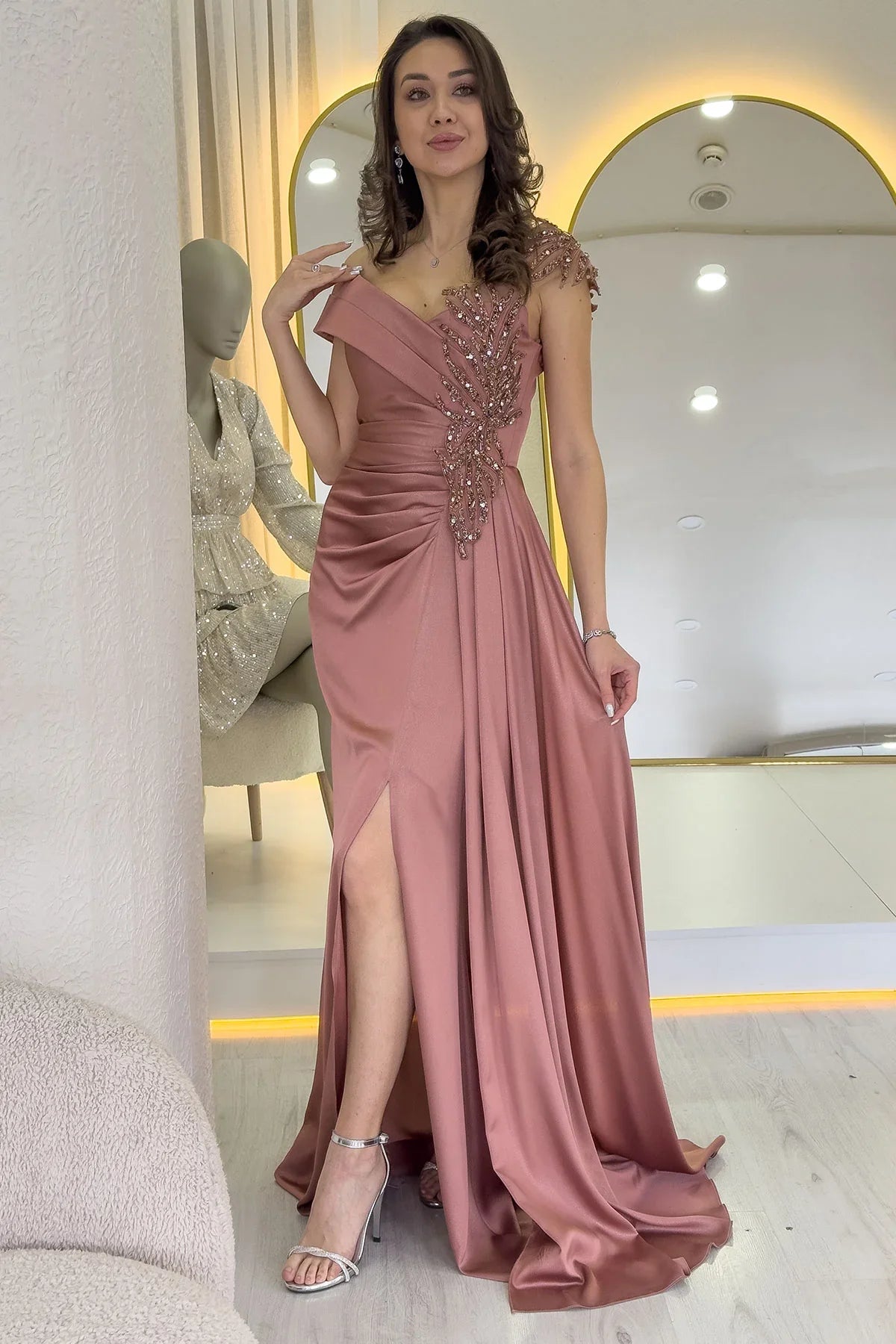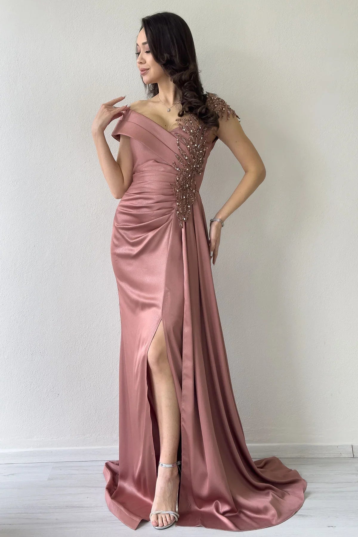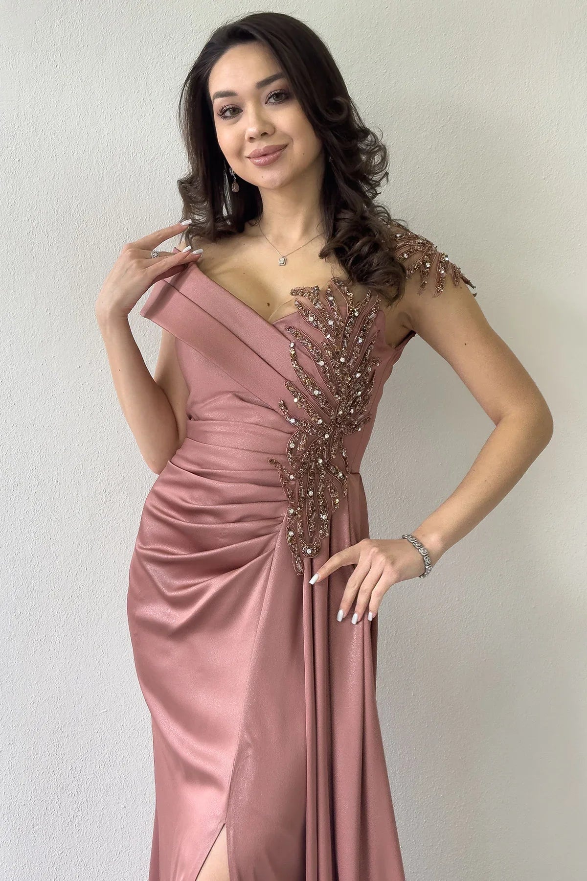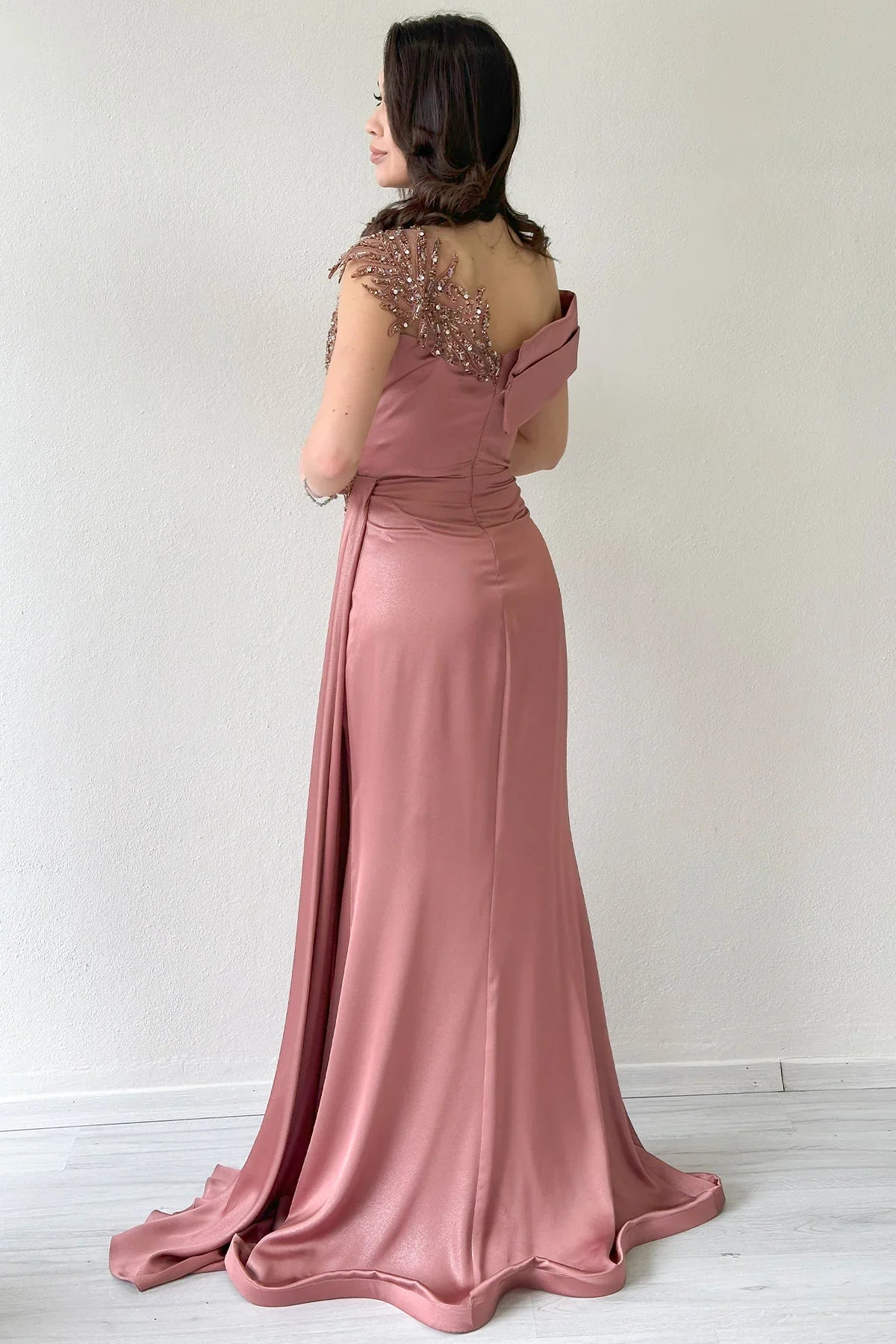 Pudra Taş İşlemeli Büzgülü Saten Yırtmaçlı Abiye Elbise