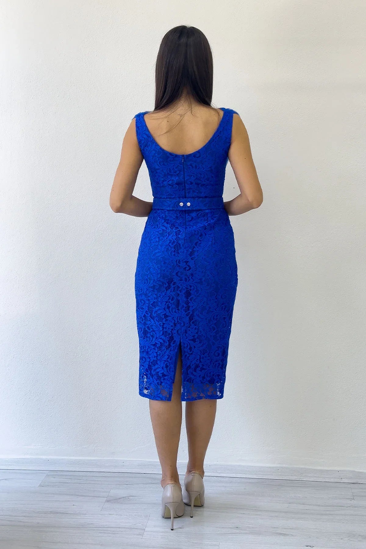 Saks Mavi Dantel Kumaş Tül Detaylı Kemerli Midi Boy Abiye Elbise