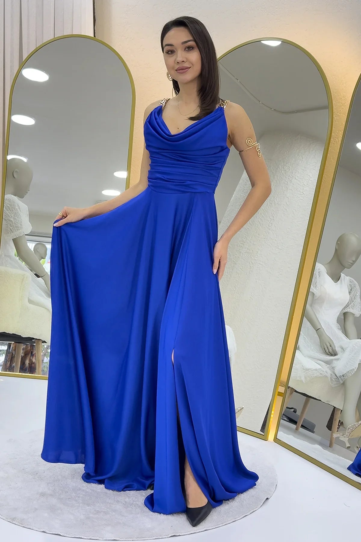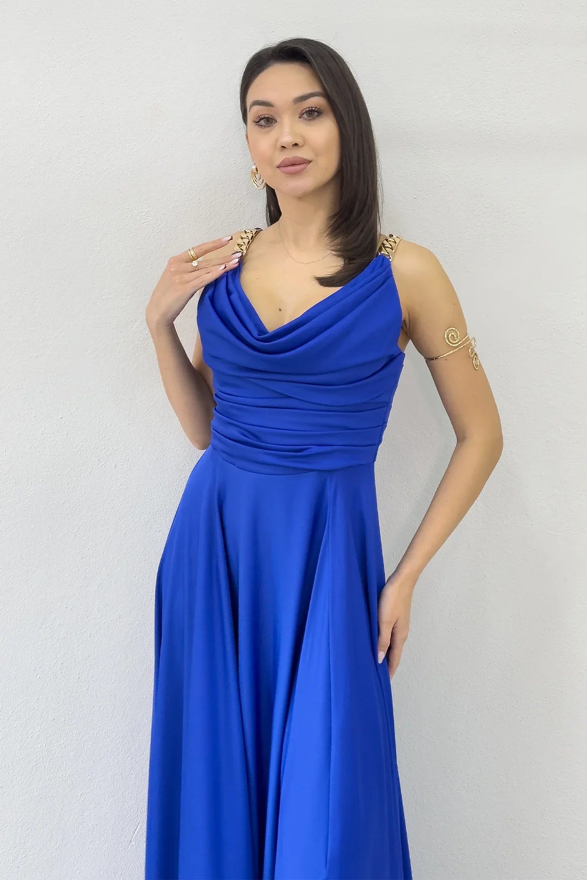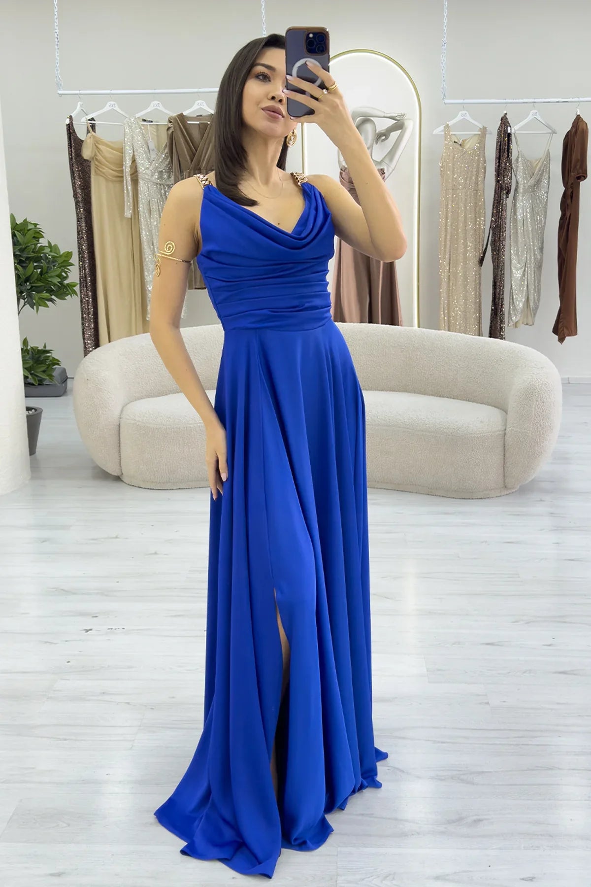 Saks Mavi Gold Askılı Ön Drapeli Saten Yırtmaçlı Abiye Elbise