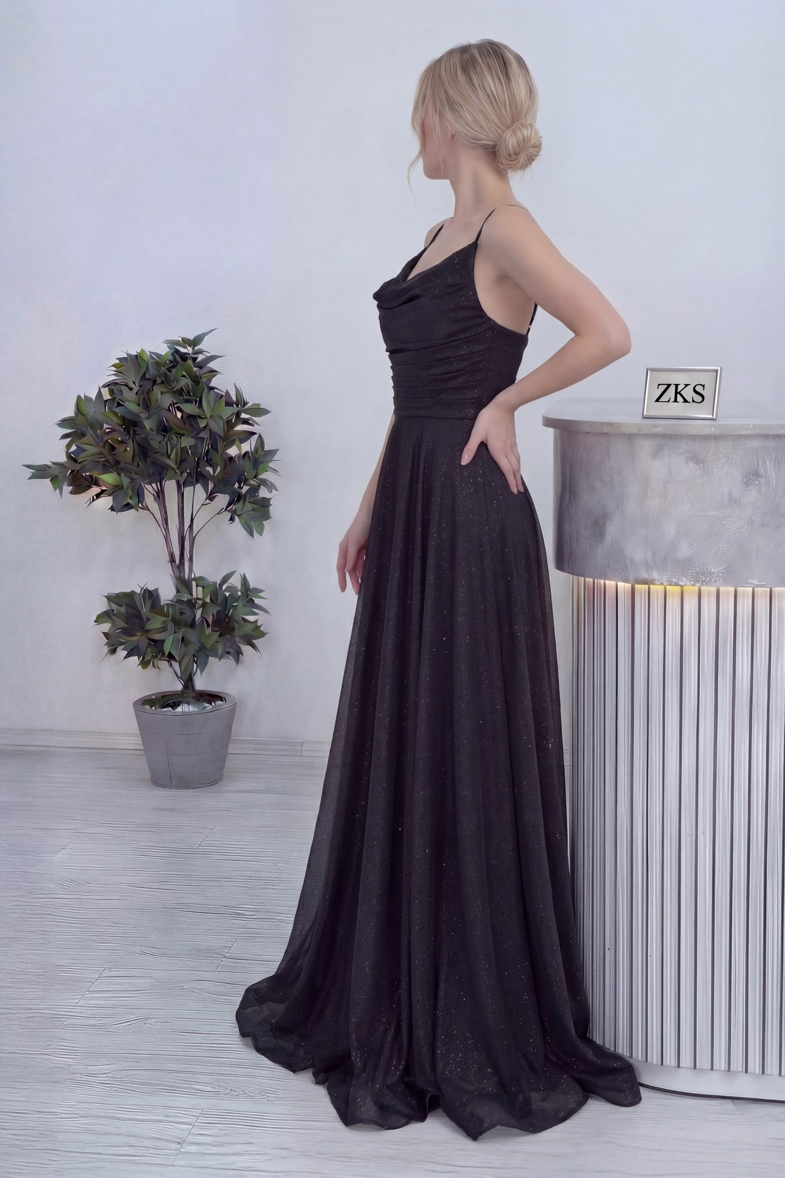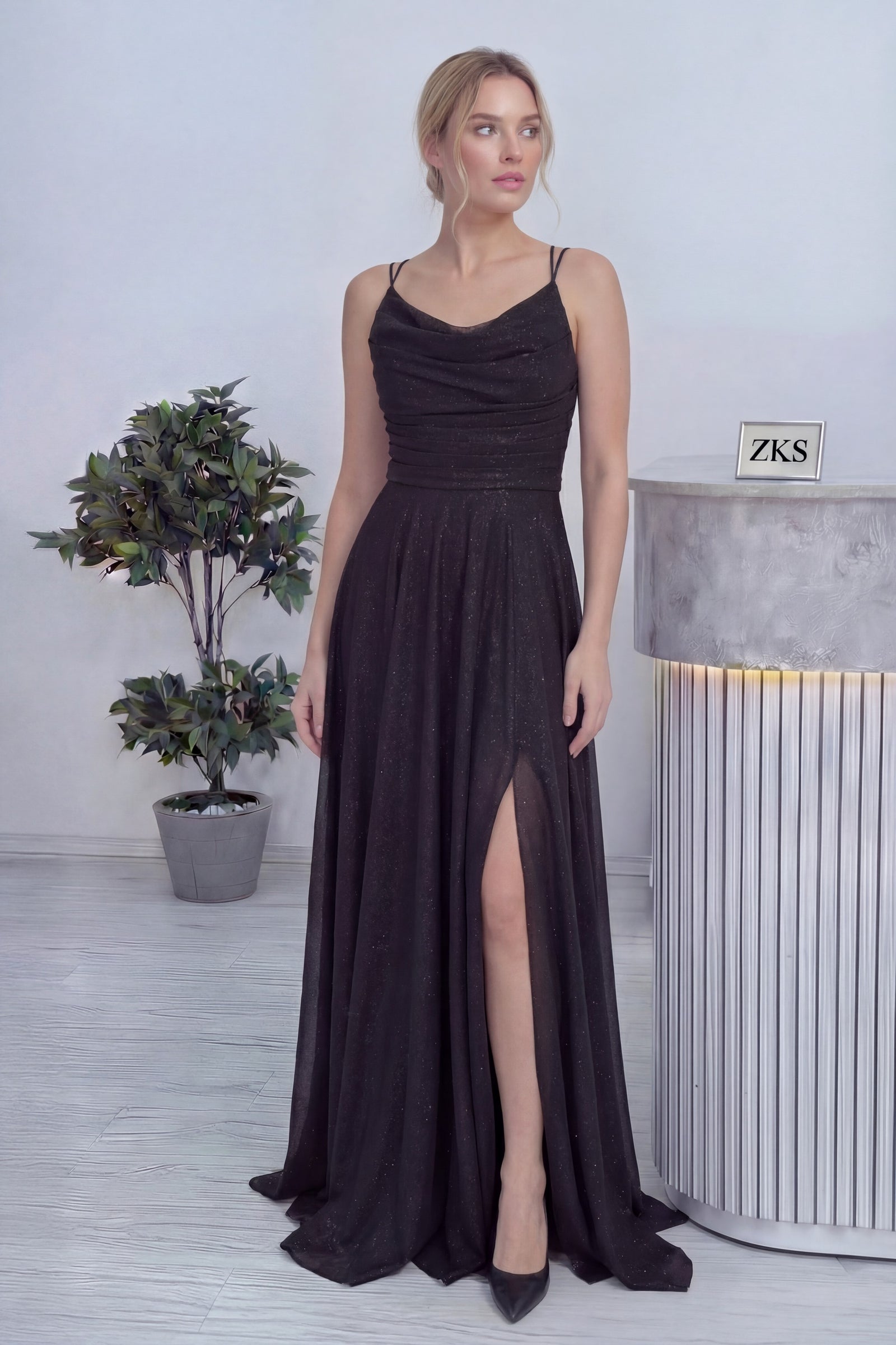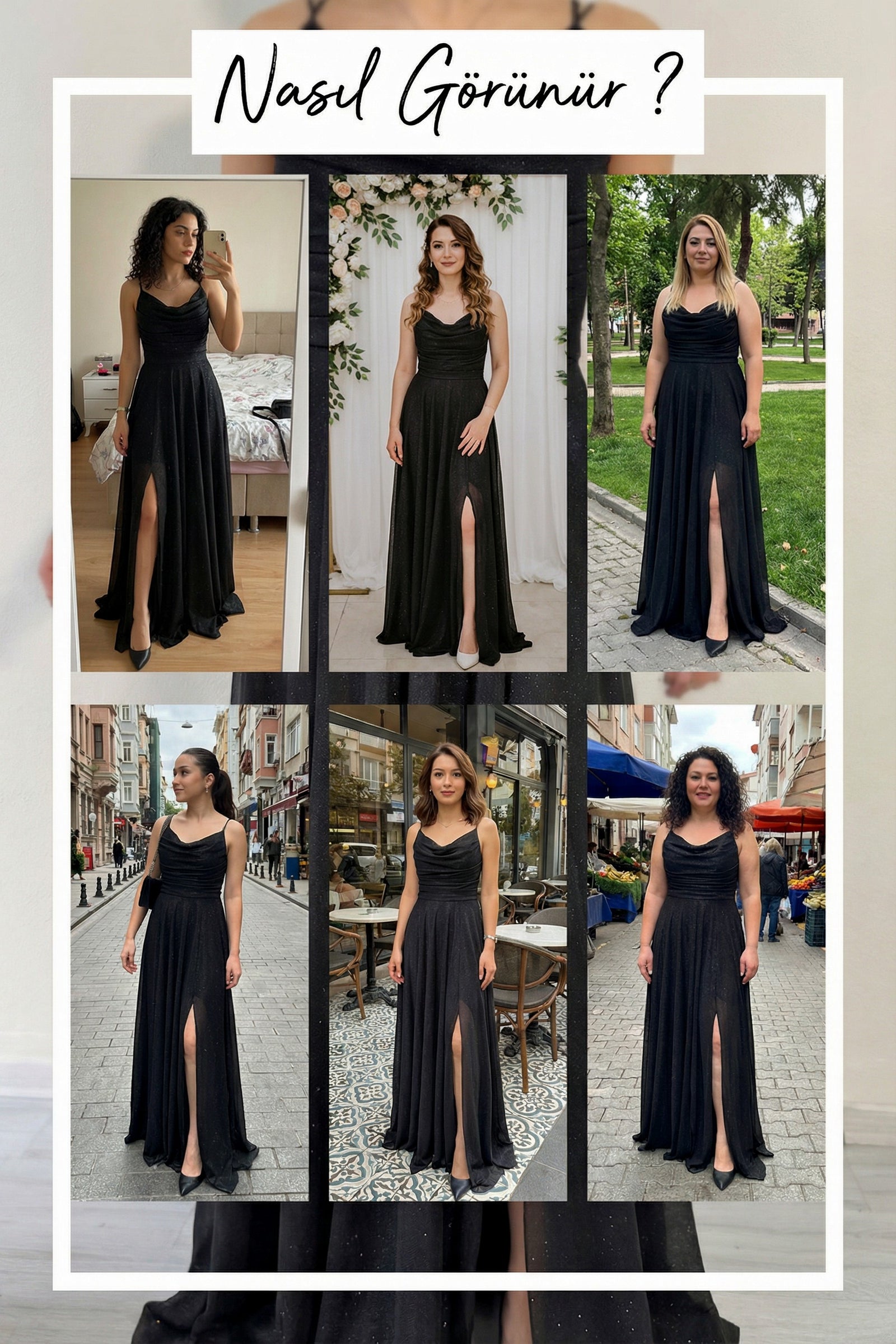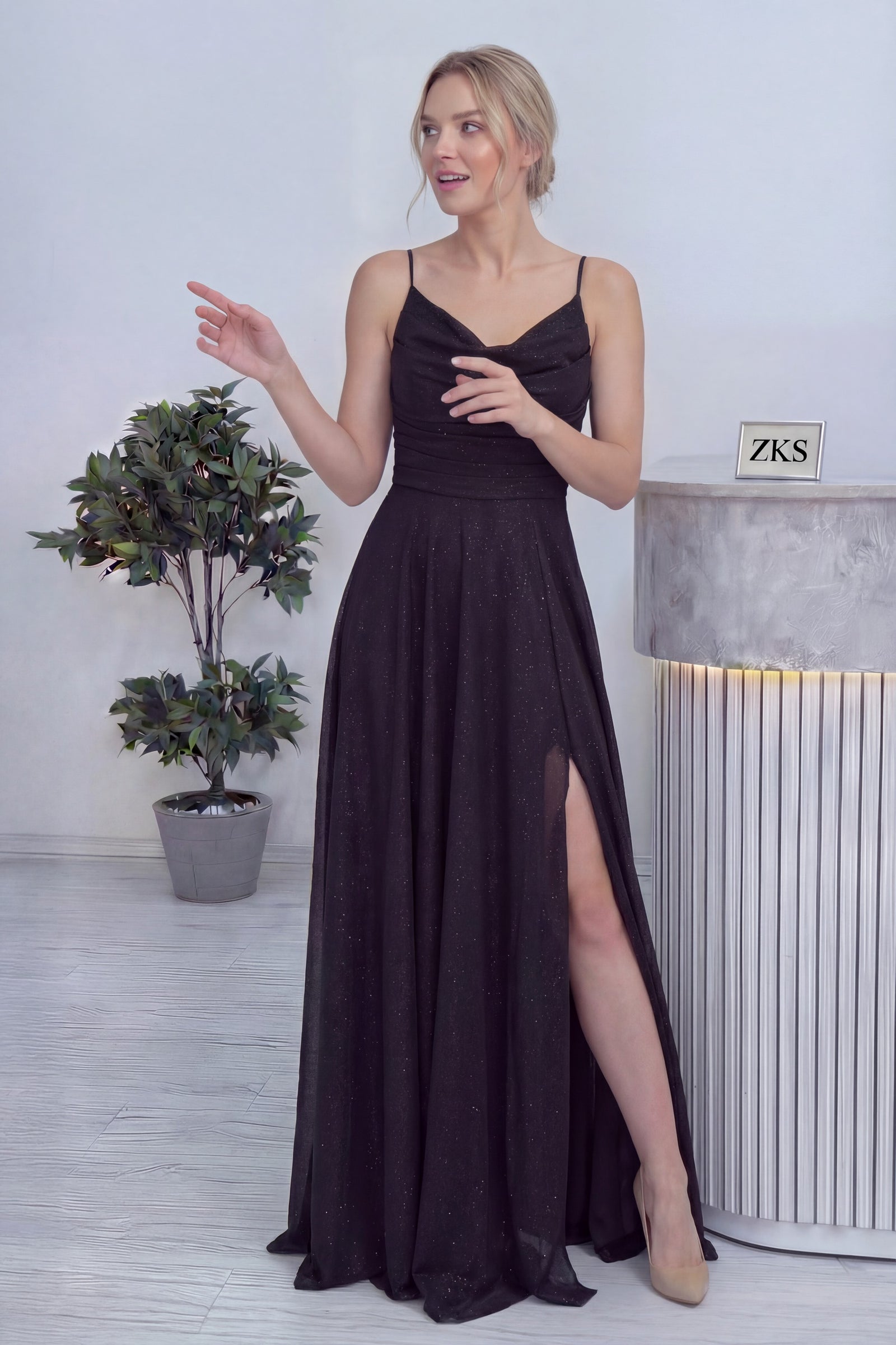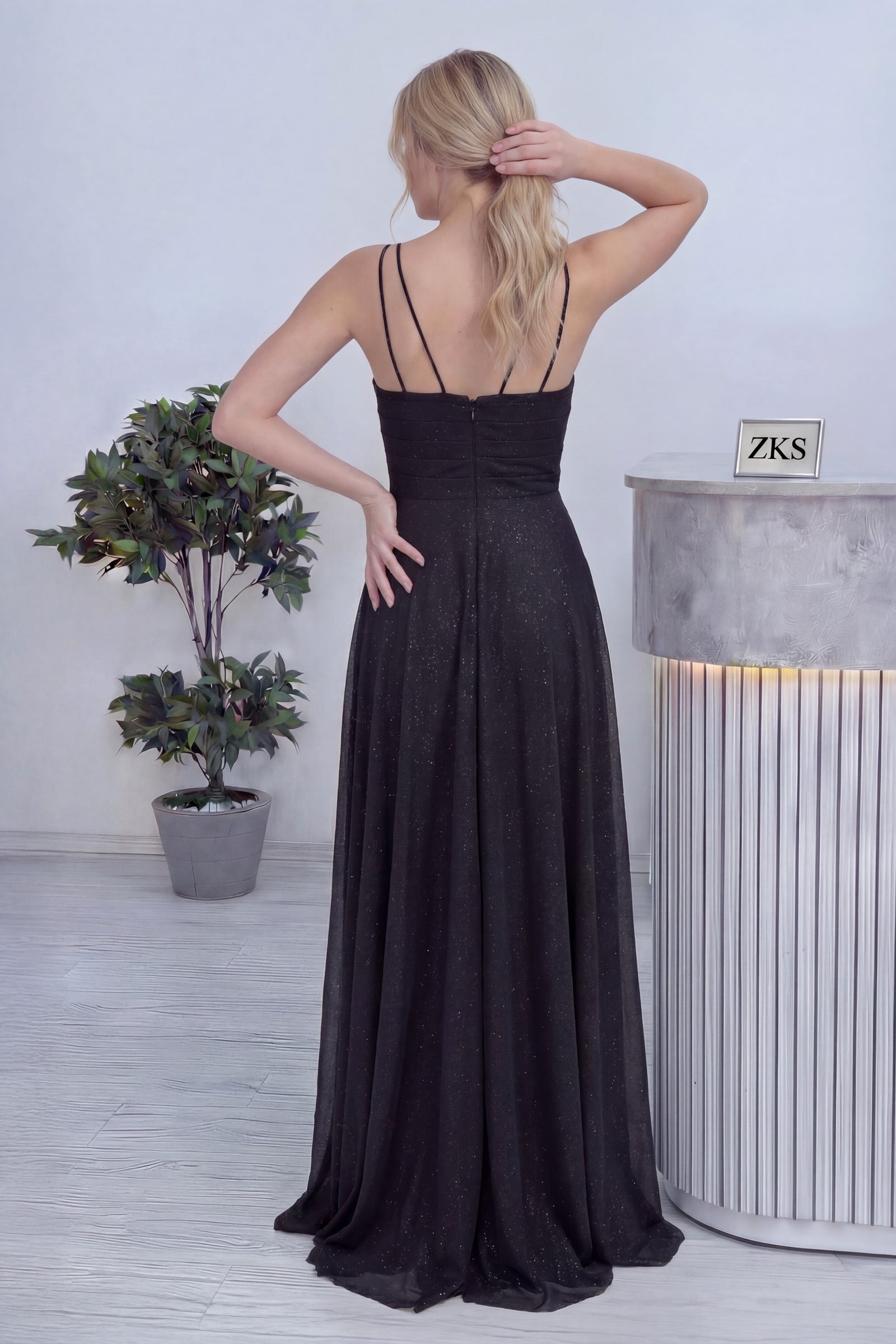 Siyah Askılı Ön Drapeli Yırtmaçlı Simli Abiye Elbise