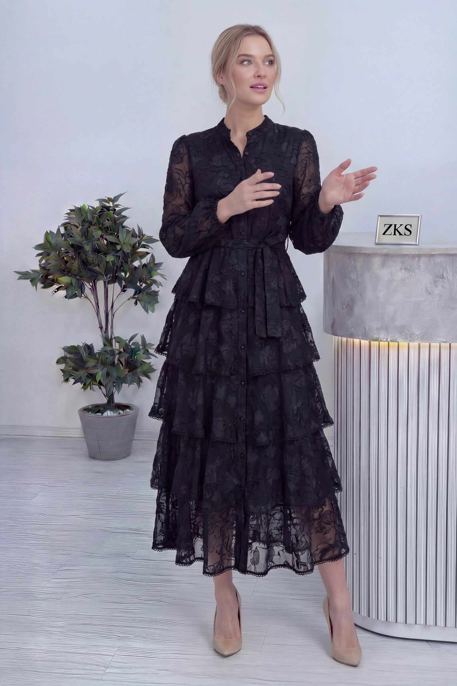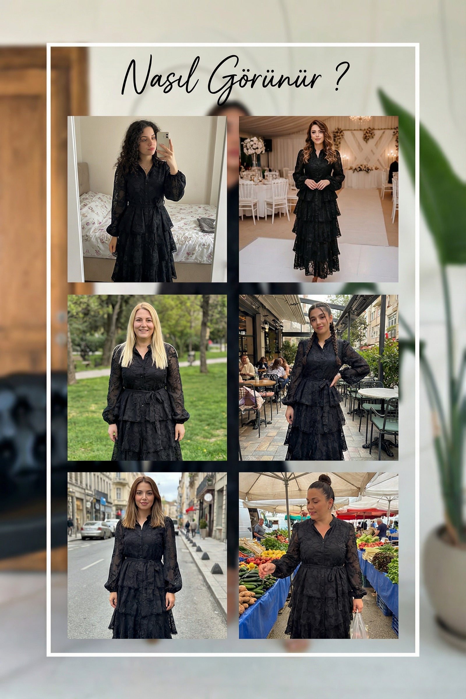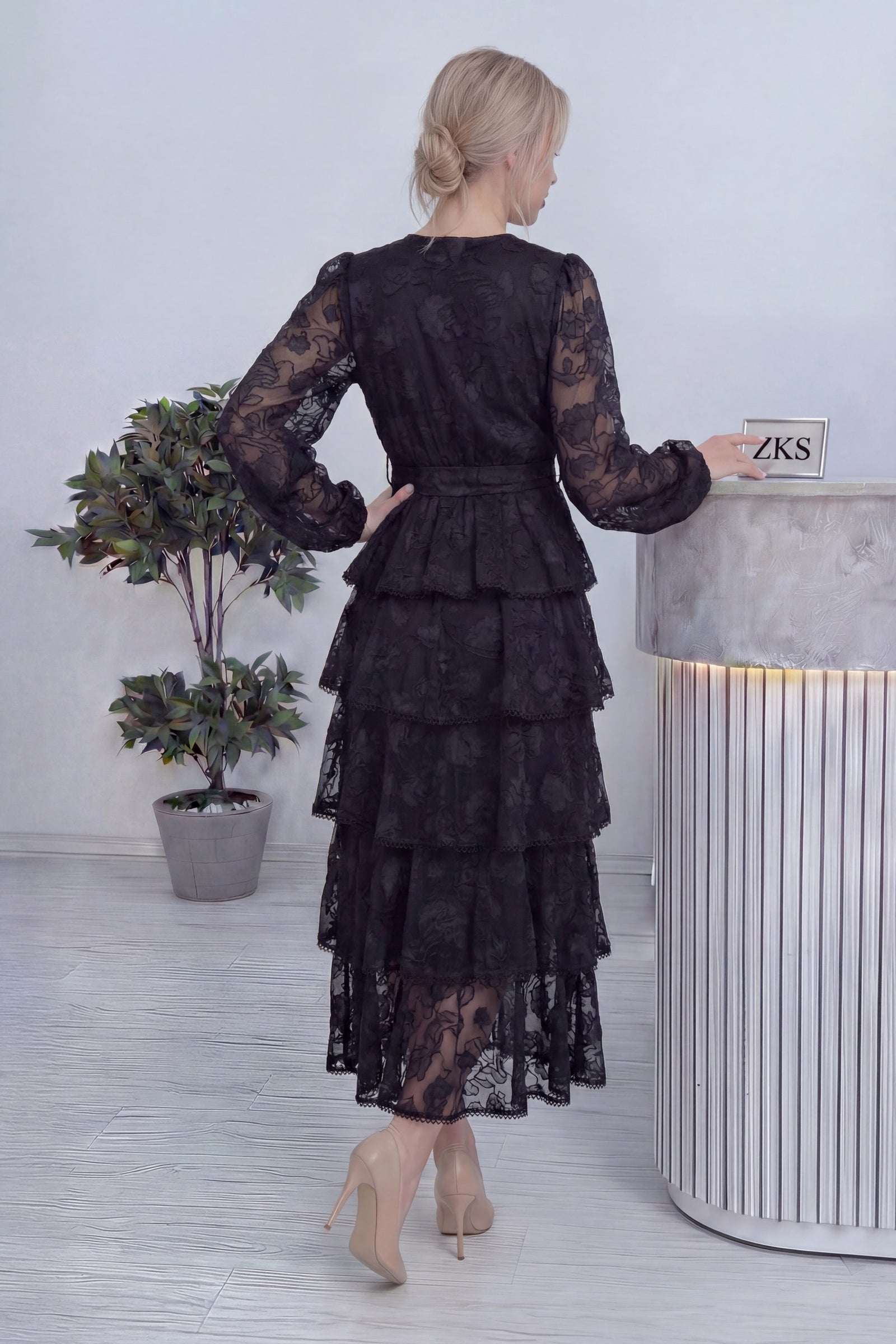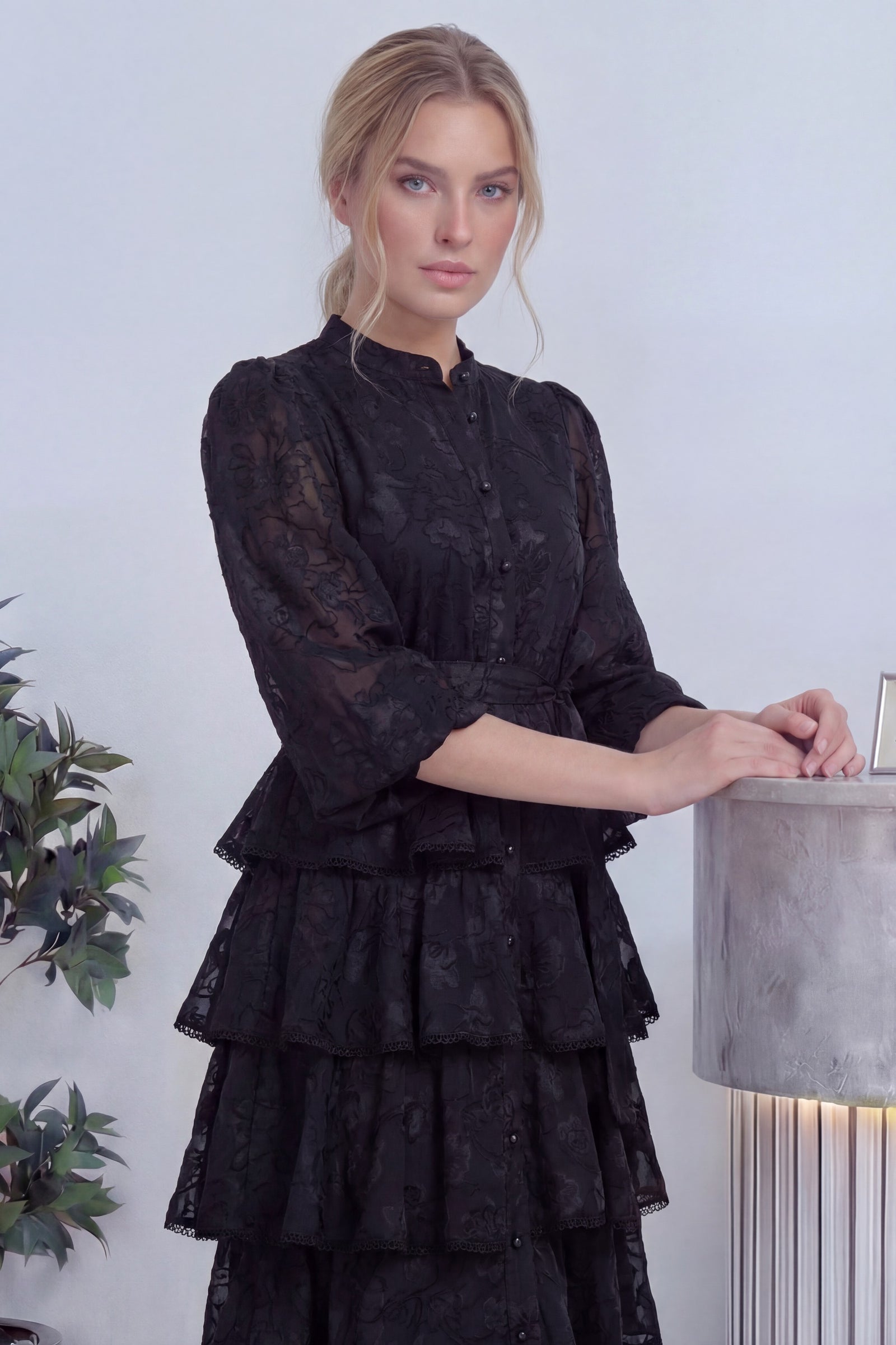 Siyah Çiçek Desenli Kat Kat Volanlı Kuşaklı Elbise