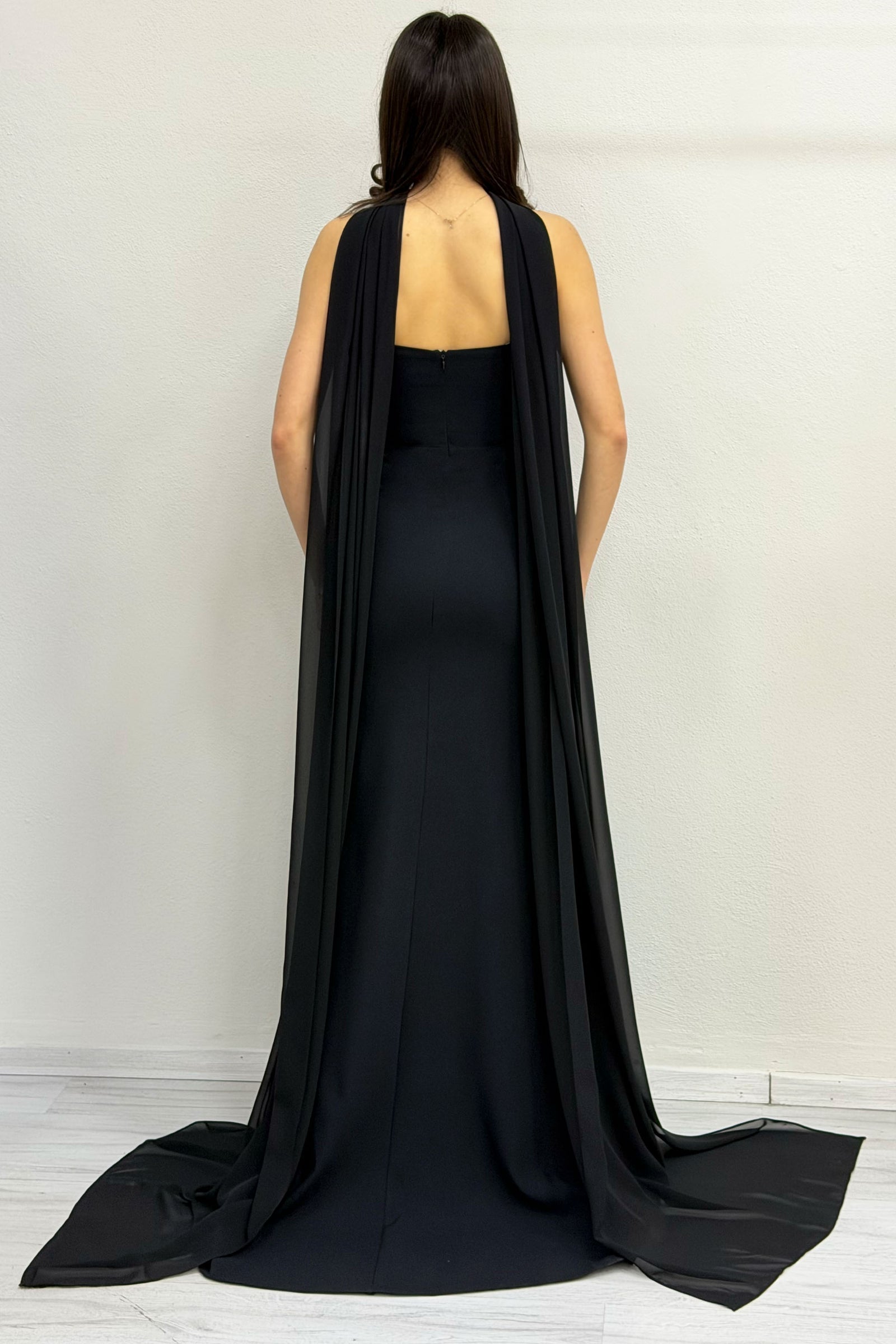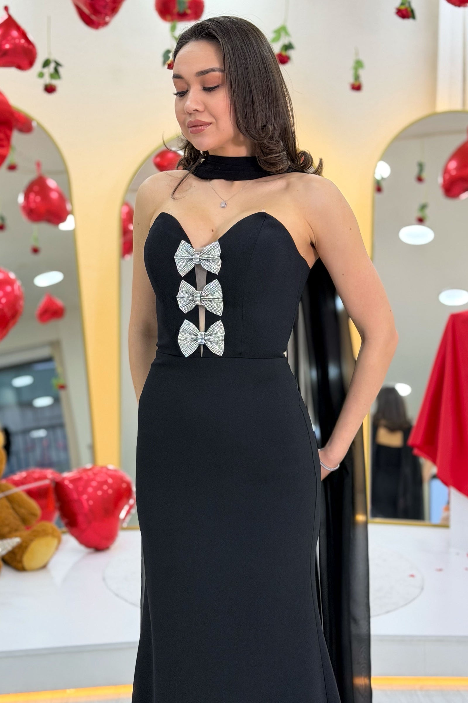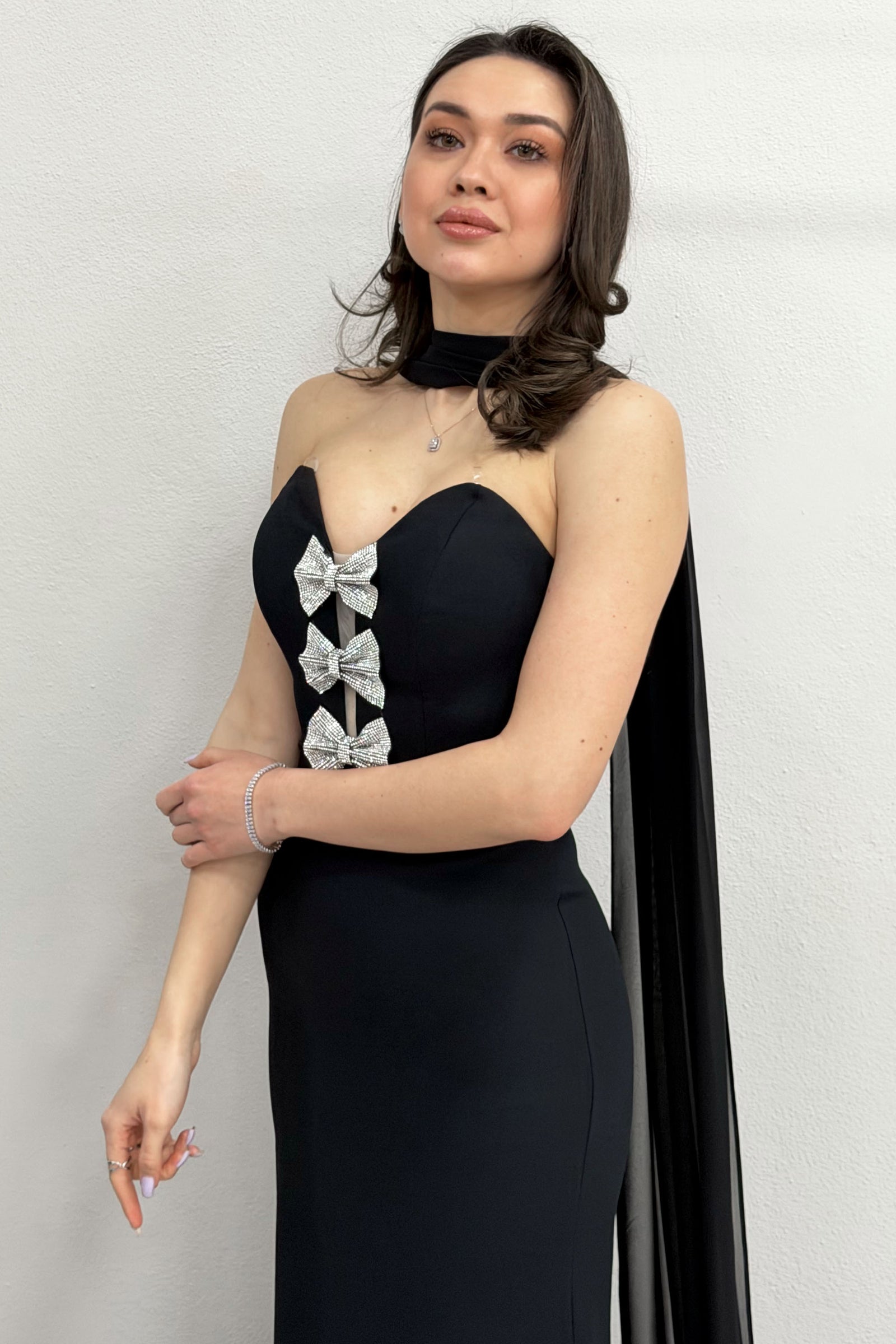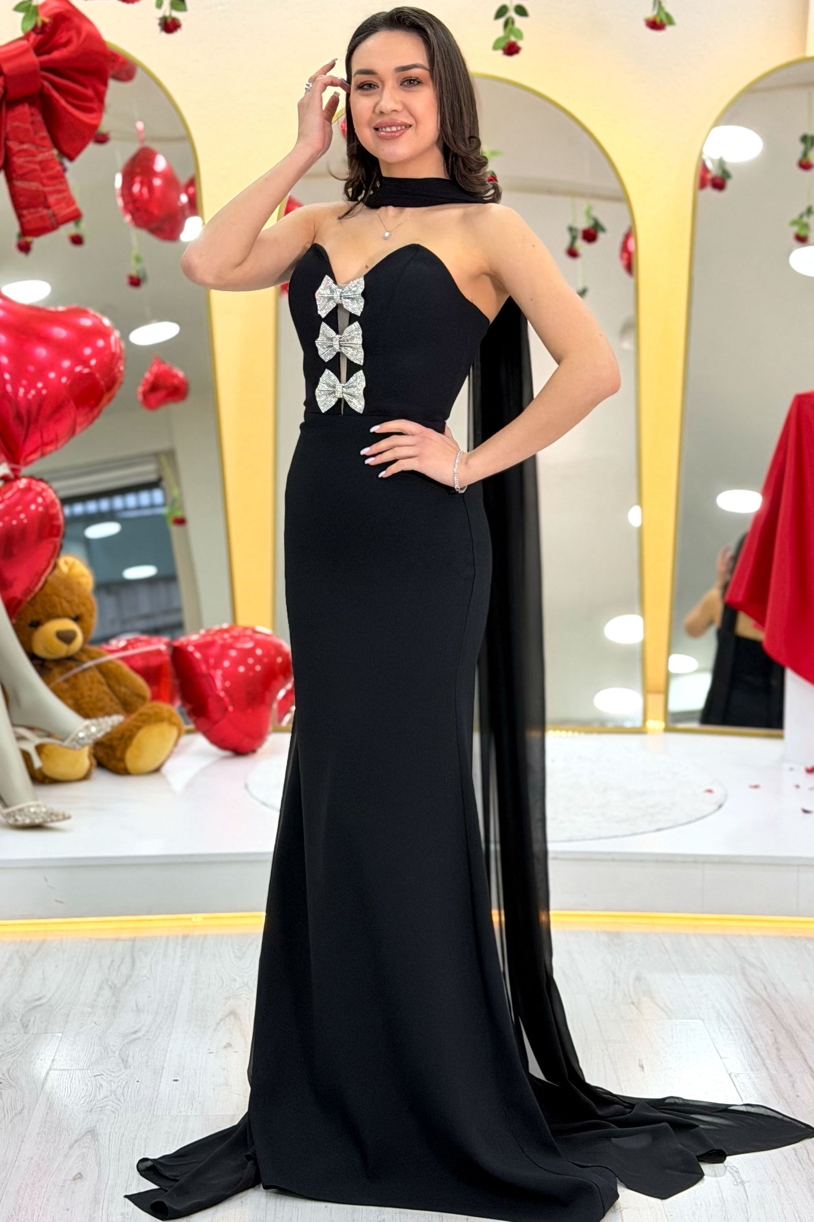Siyah Fiyonk Detaylı Fularlı Straplez Balık Abiye Elbise