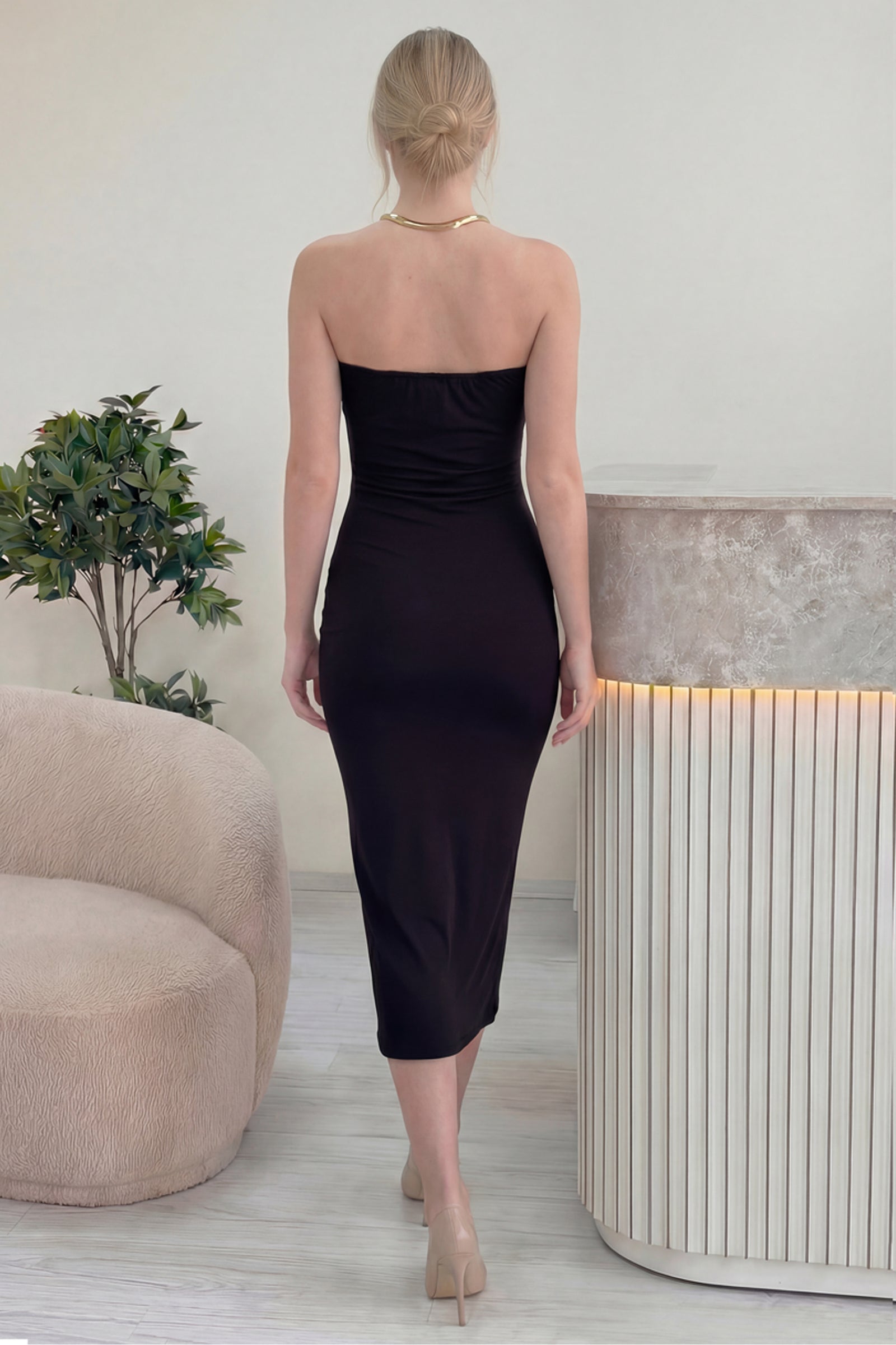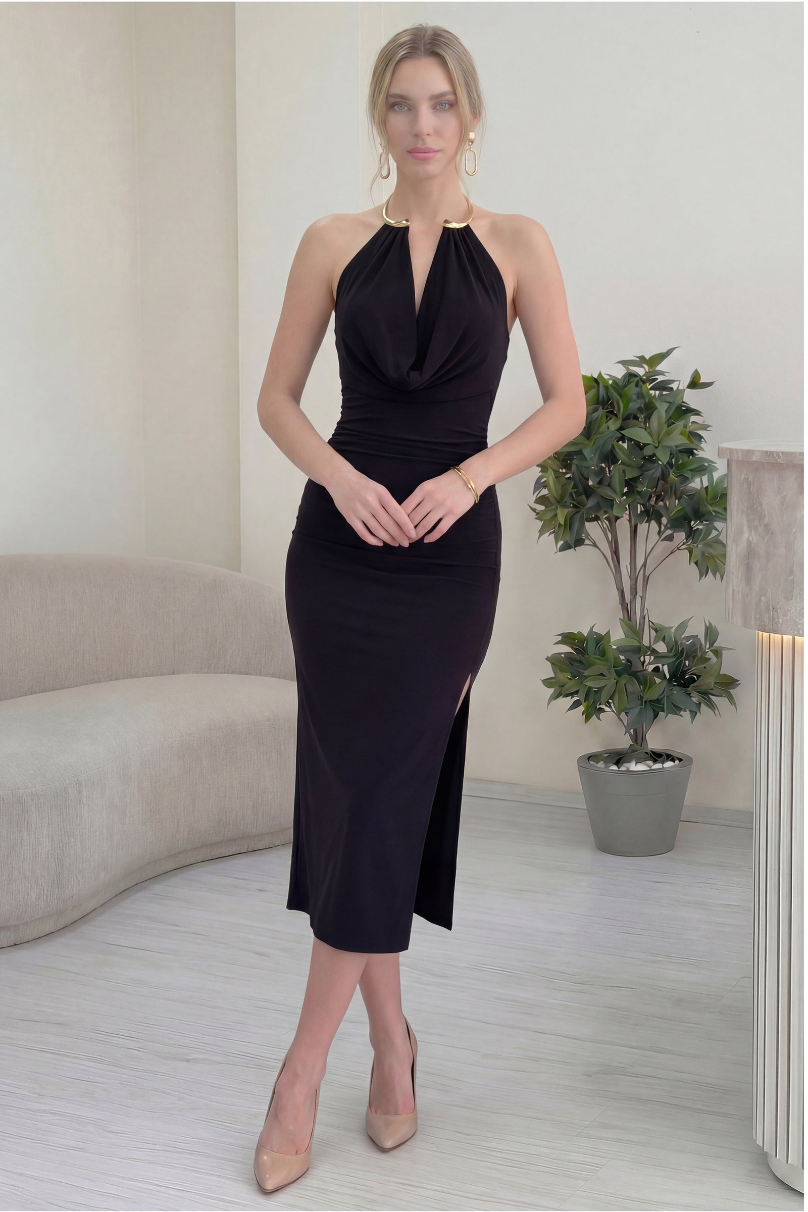Siyah Gold Aksesuarlı Degaje Yaka Yırtmaçlı Midi Boy Elbise