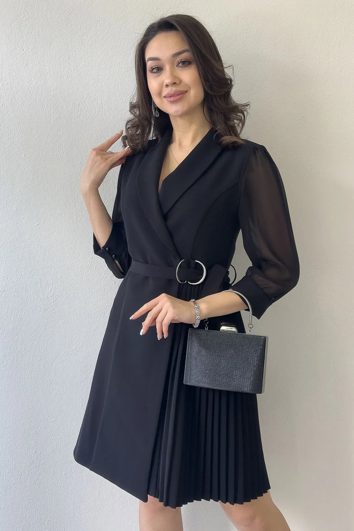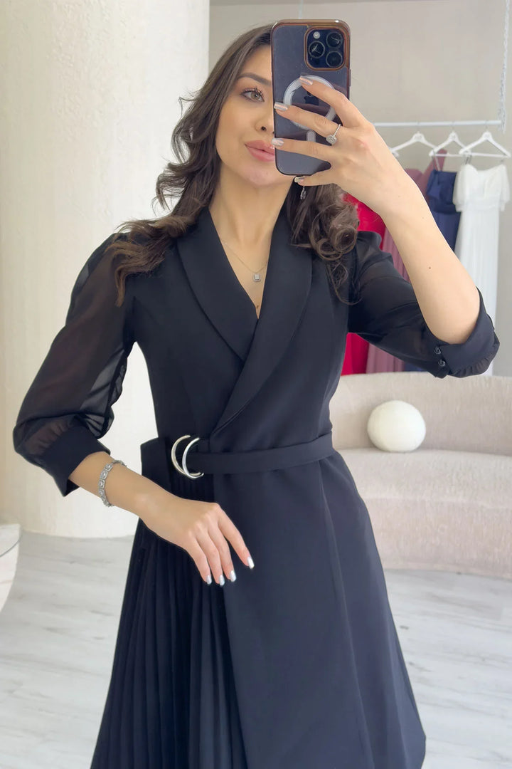 Siyah Gümüş Tokalı Uzun Kollu Piliseli Ceket Elbise