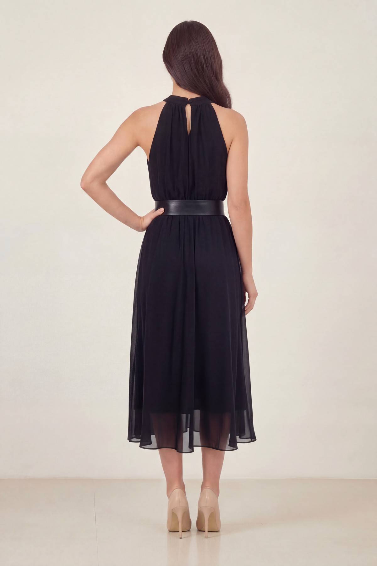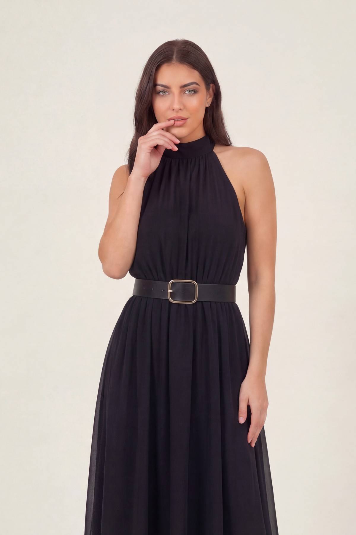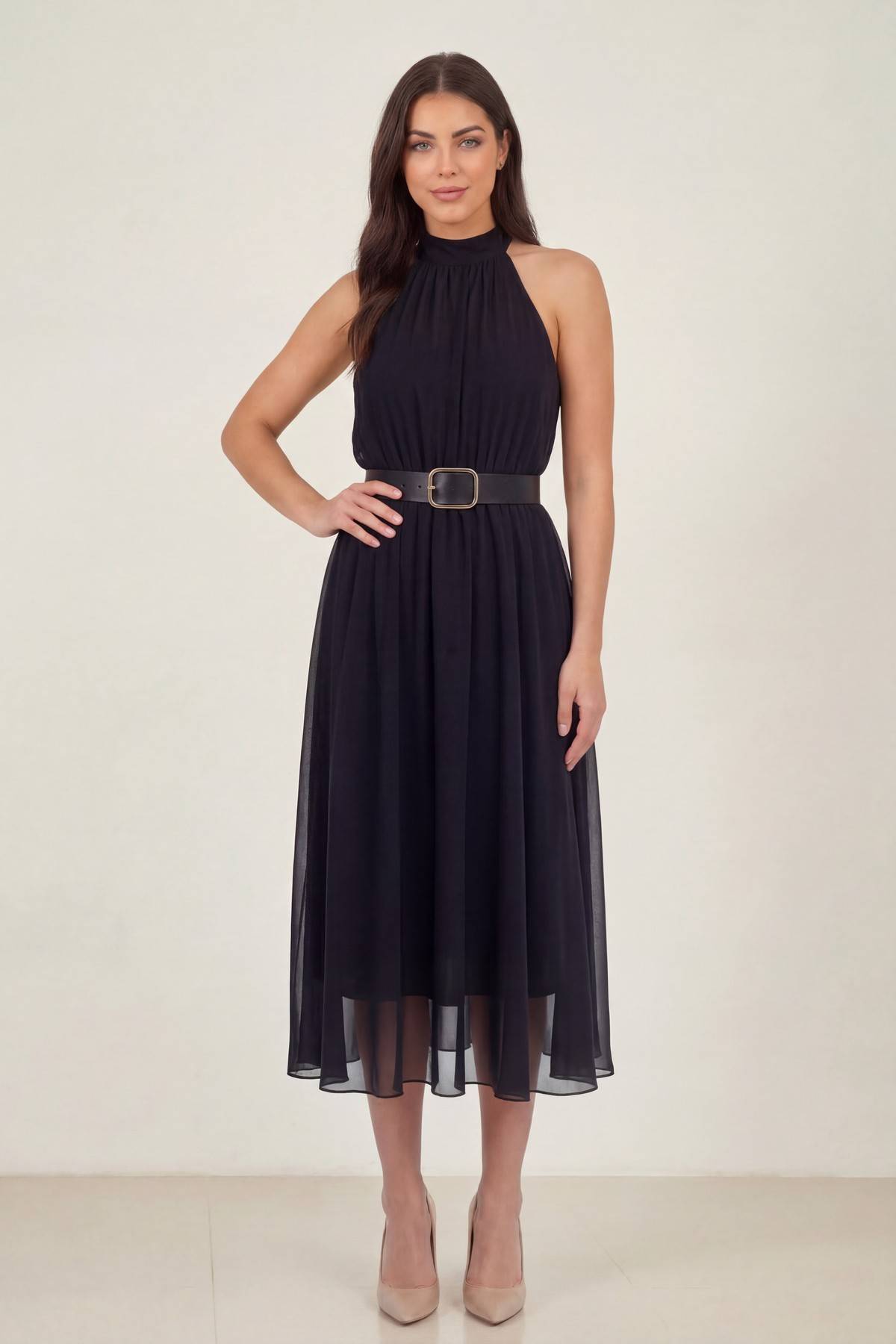 Siyah Halter Yaka Kemerli Şifon Midi Elbise – Dökümlü