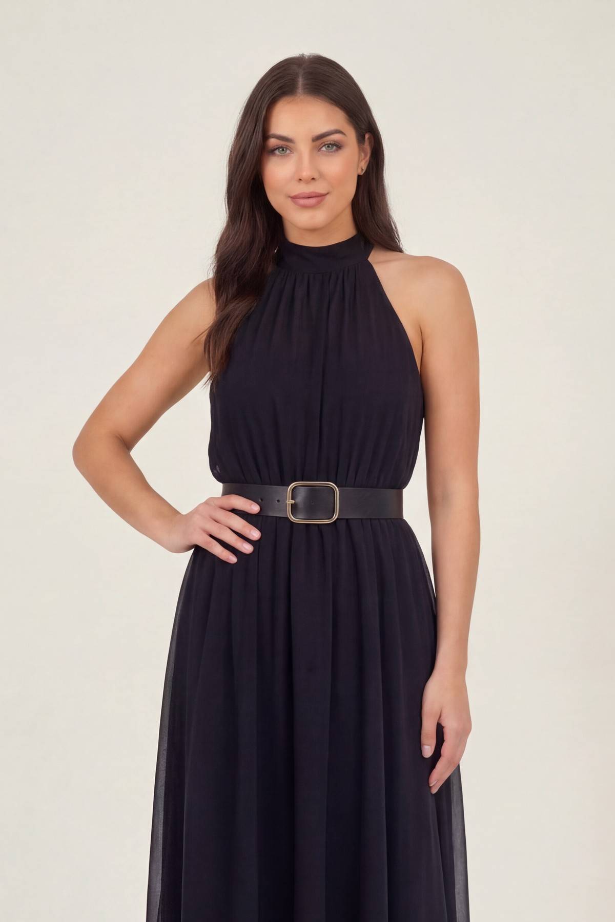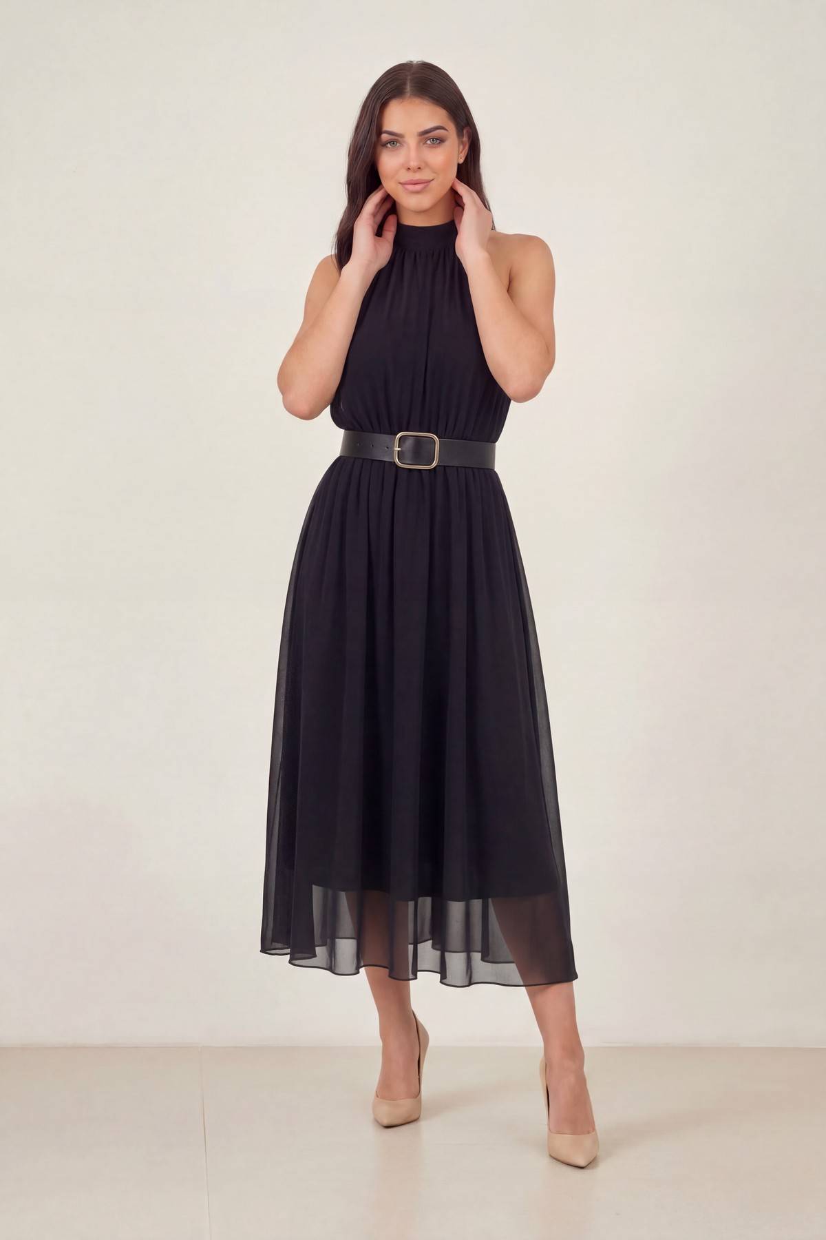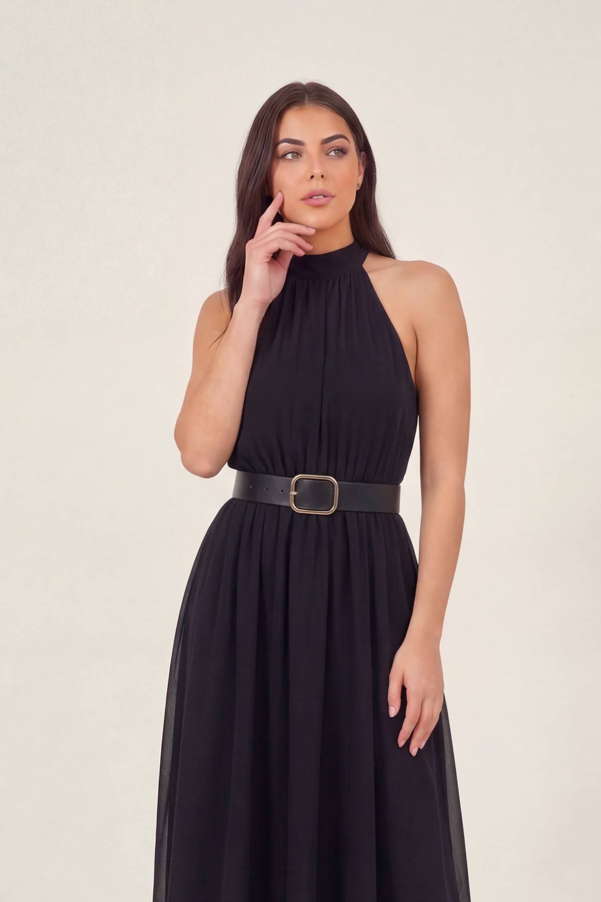 Siyah Halter Yaka Kemerli Şifon Midi Elbise – Dökümlü