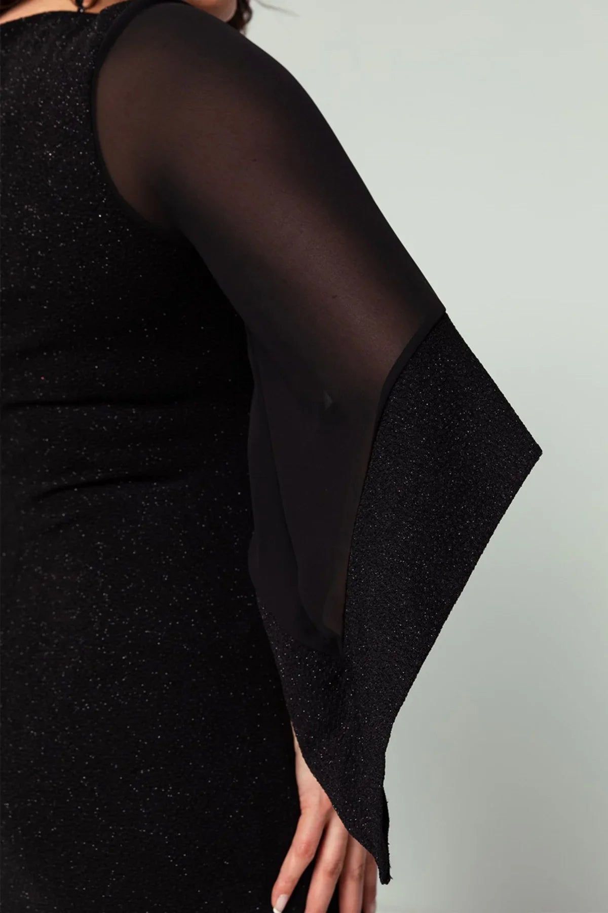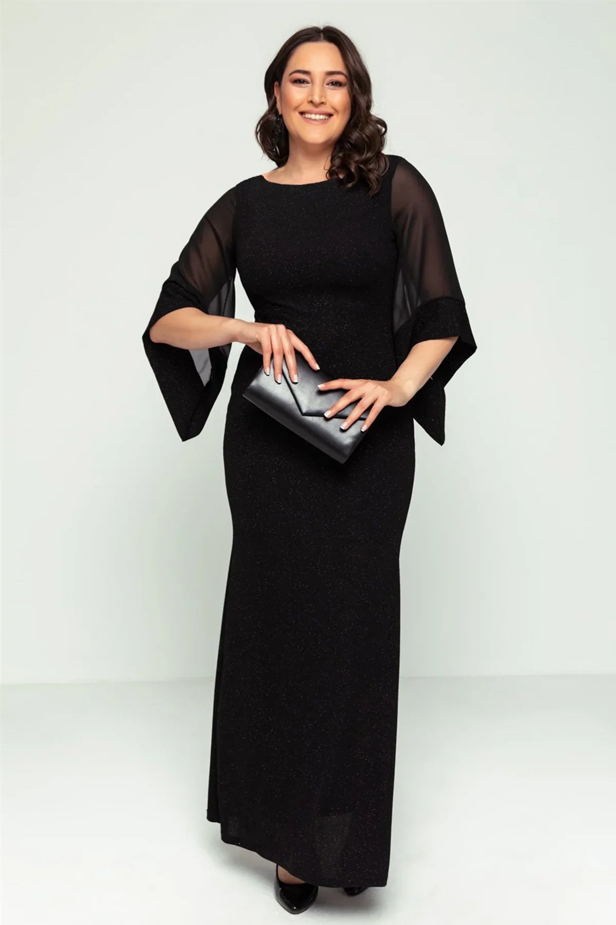 Siyah Kadın Büyük Beden Kolu Şifon Simli Abiye Elbise