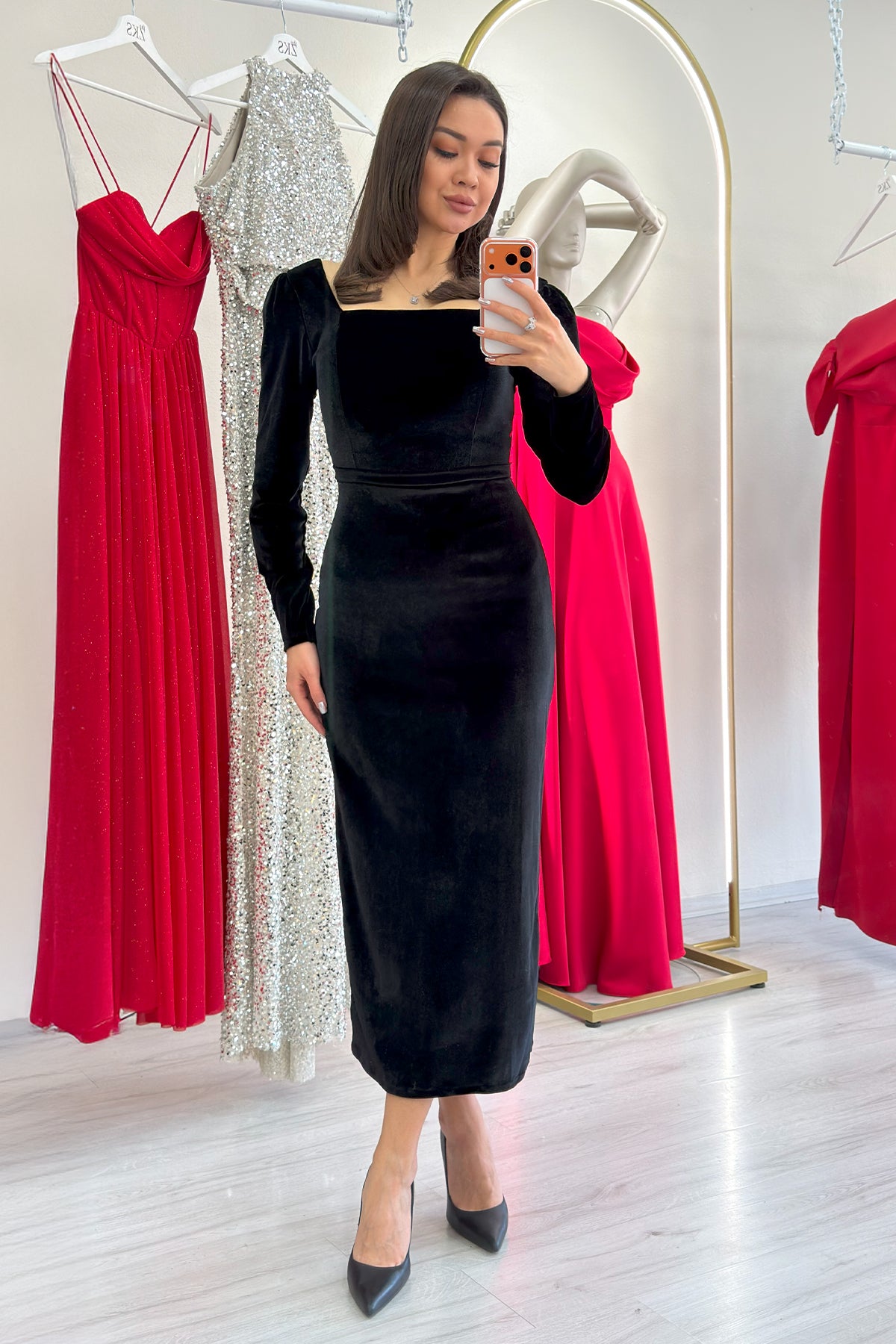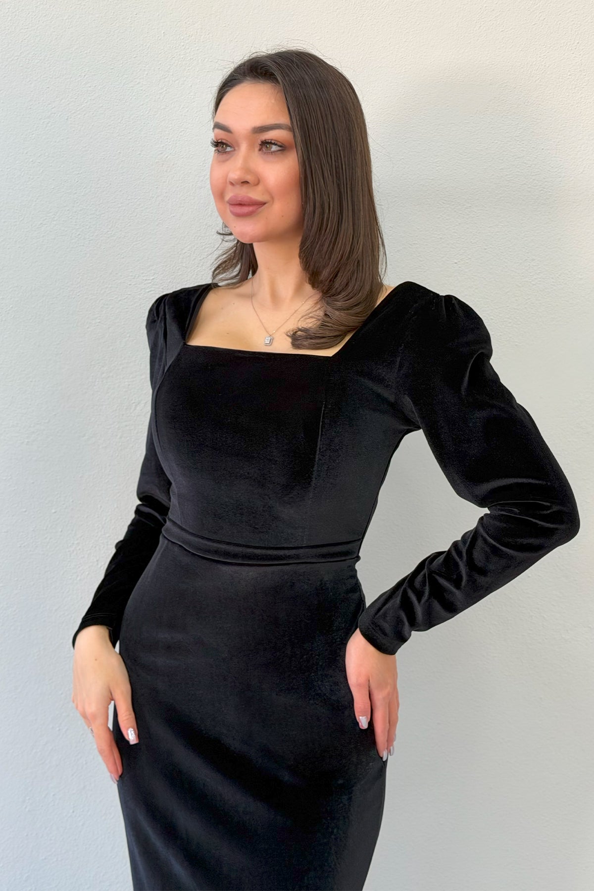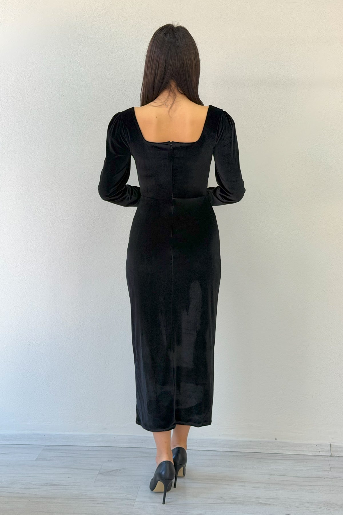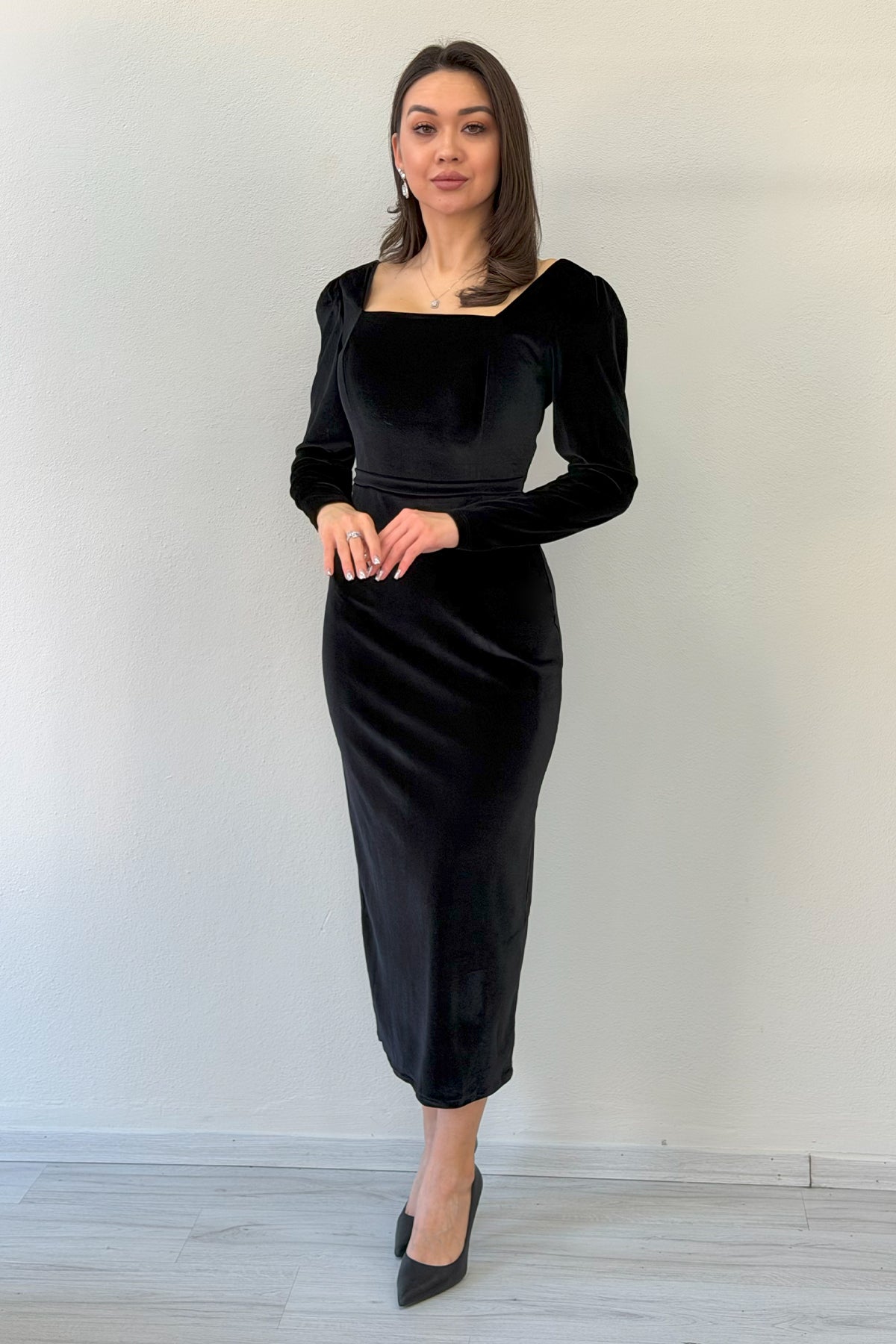 Siyah Kare Yaka Kadife Midi Boy Elbise