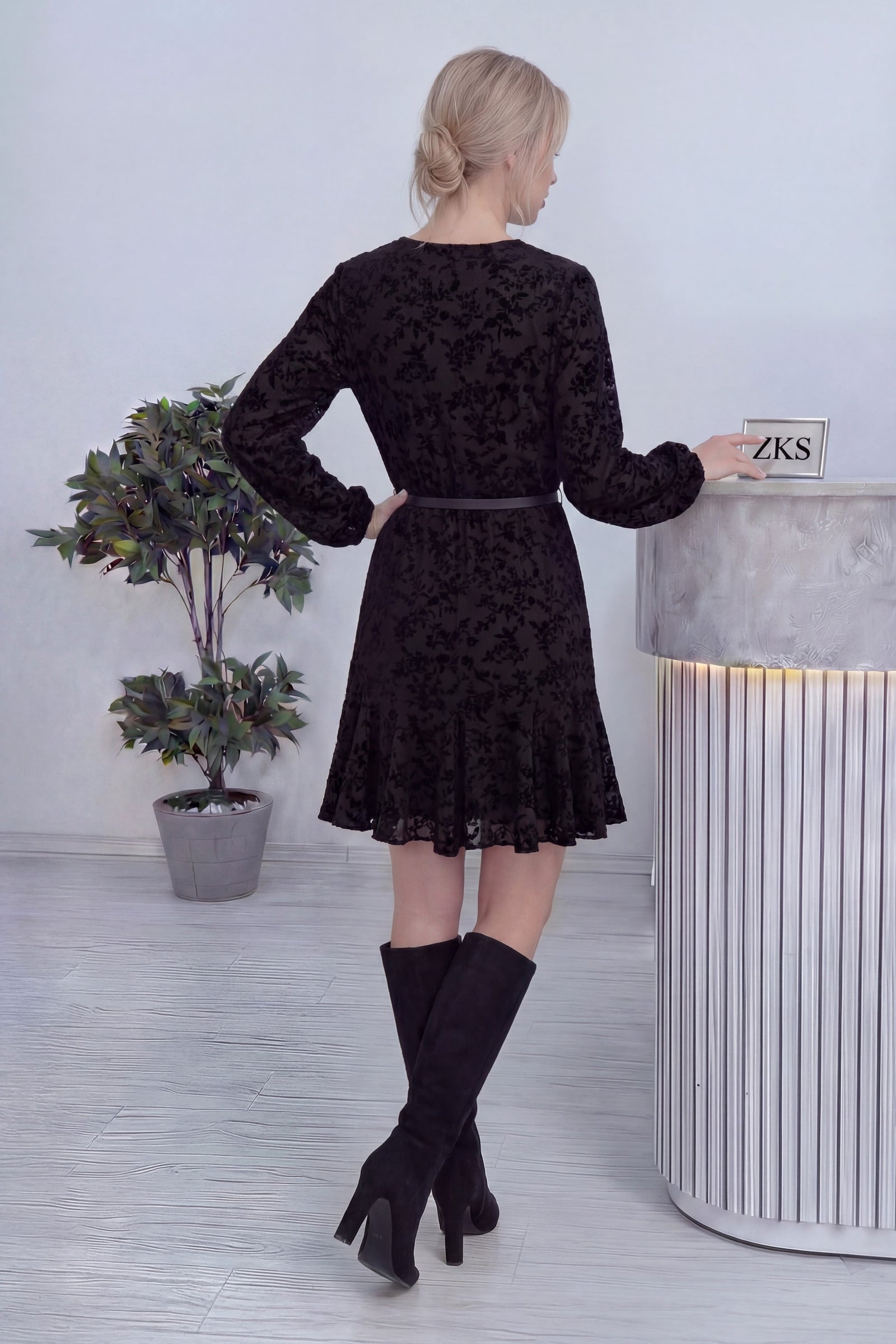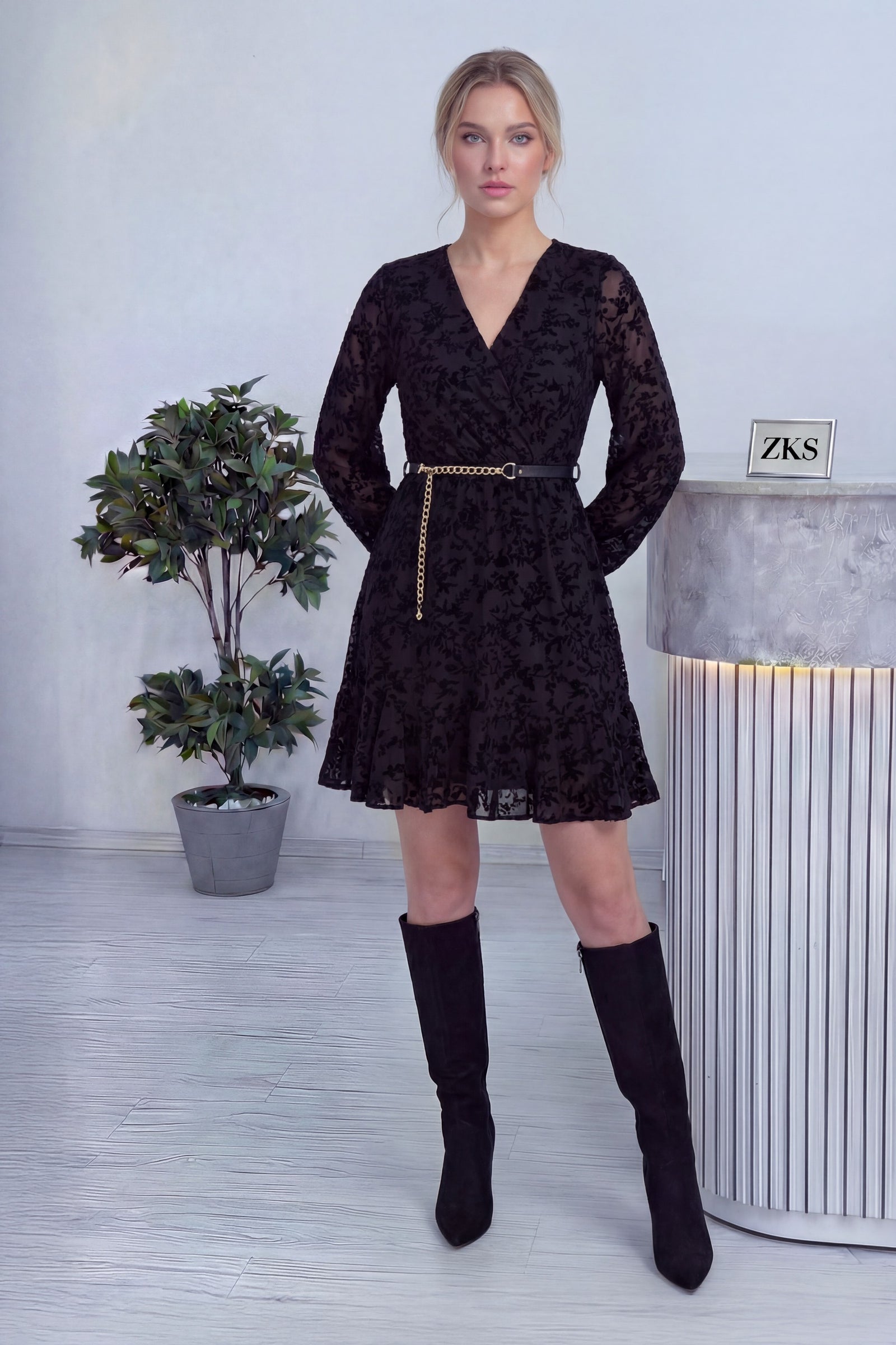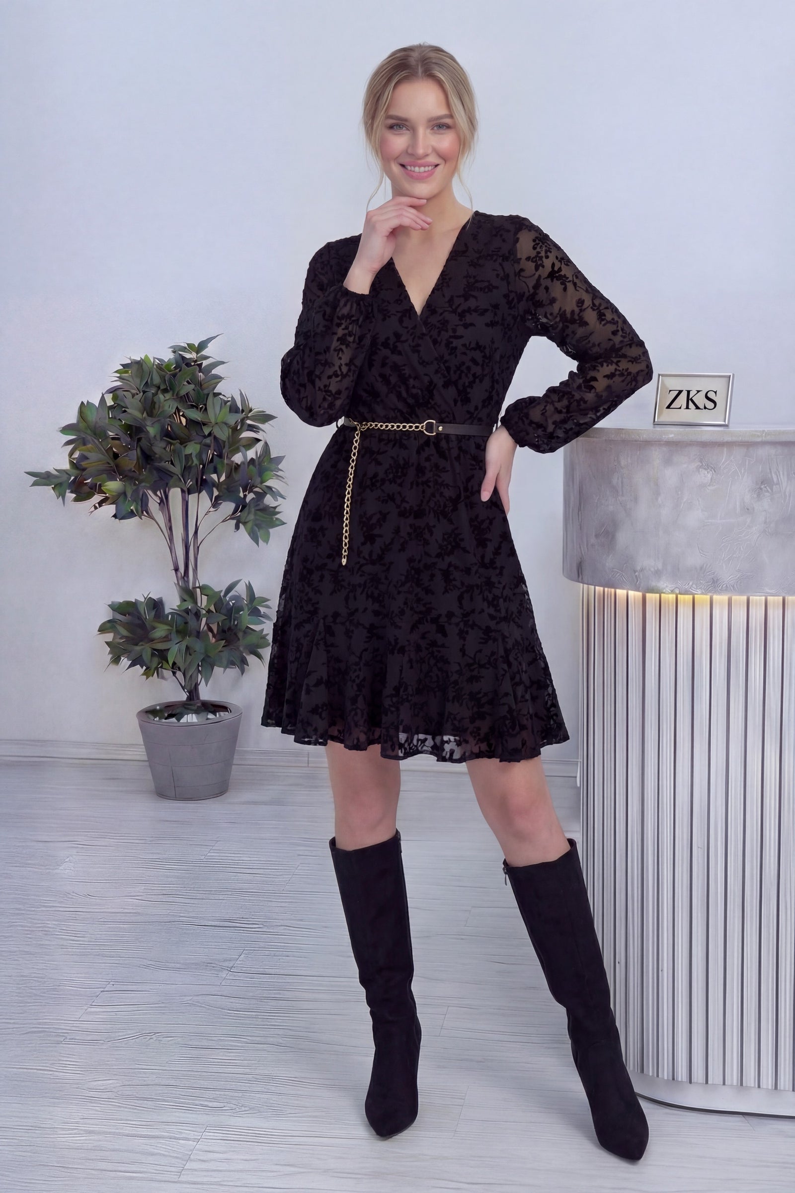 Siyah Kemerli Kruvaze Yaka Desenli Elbise