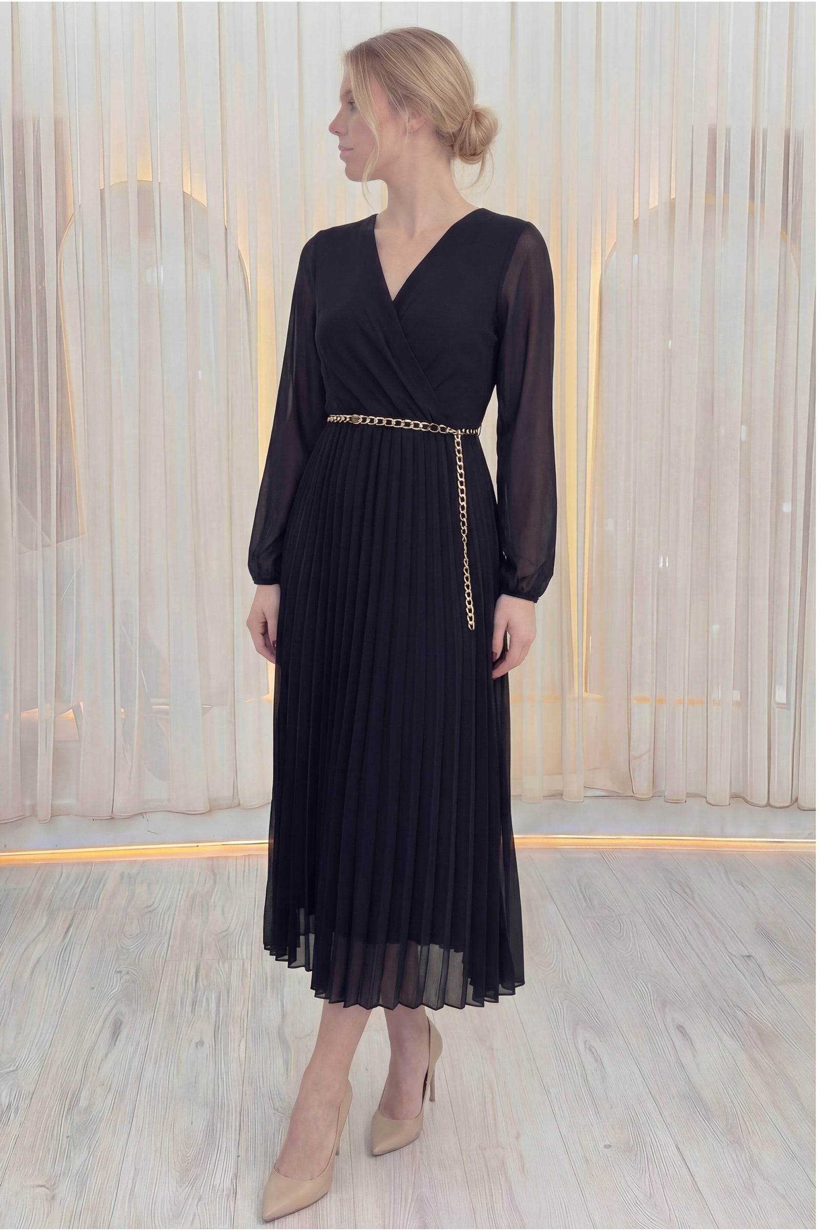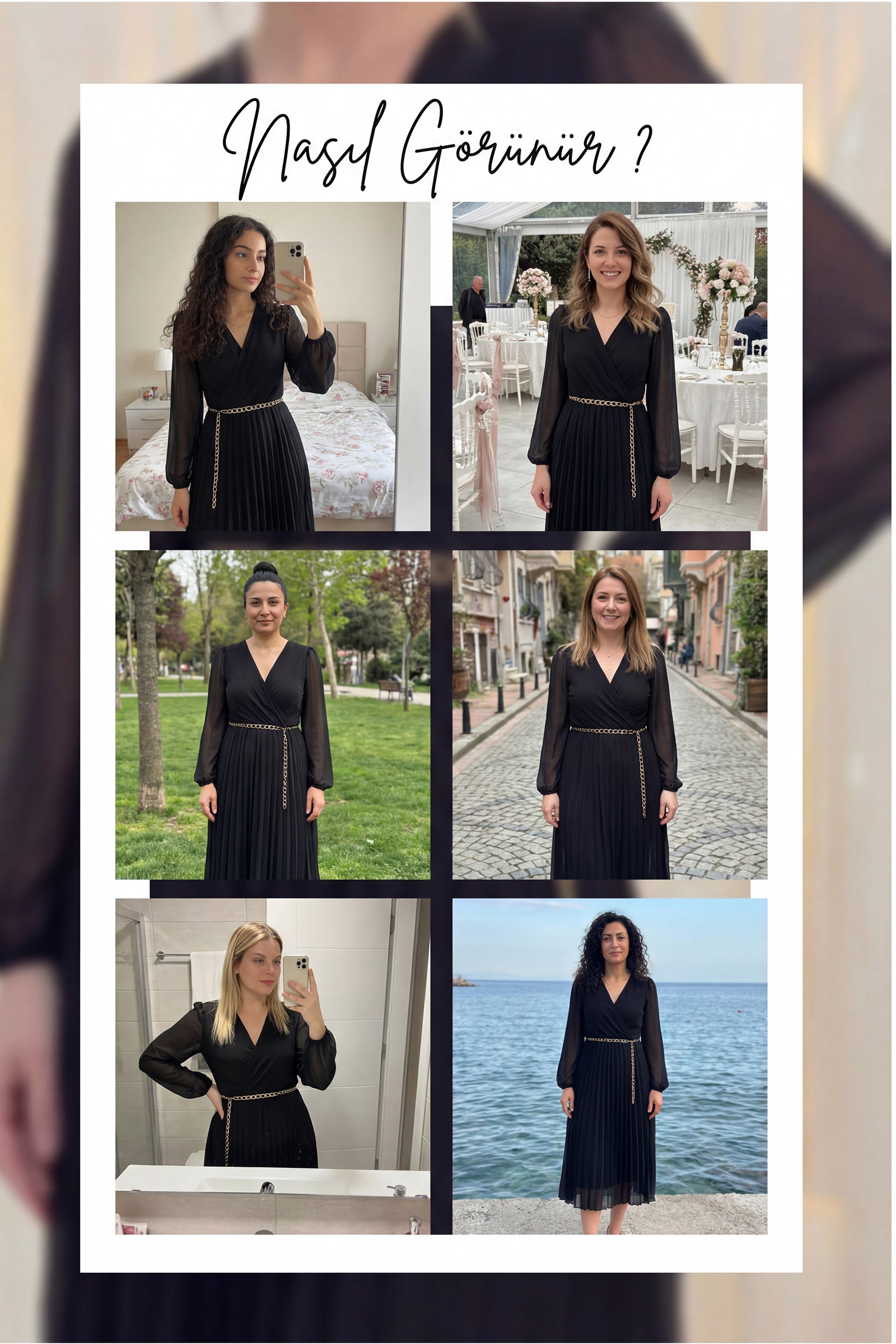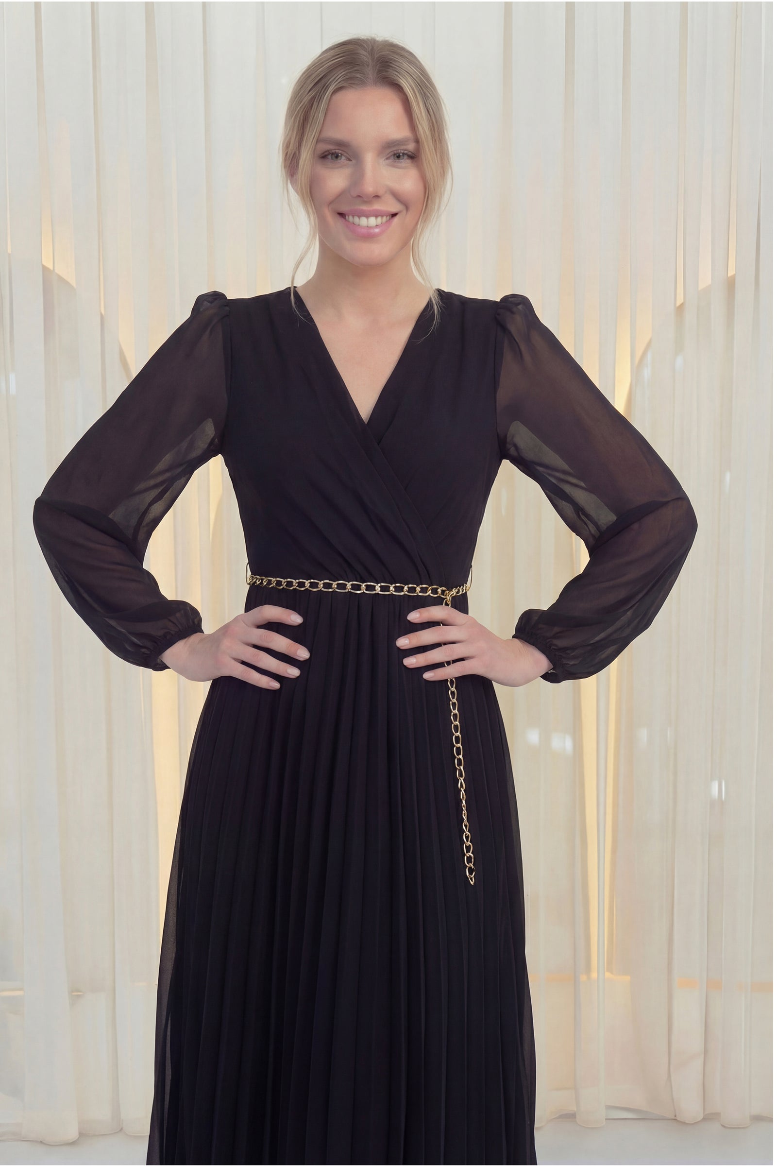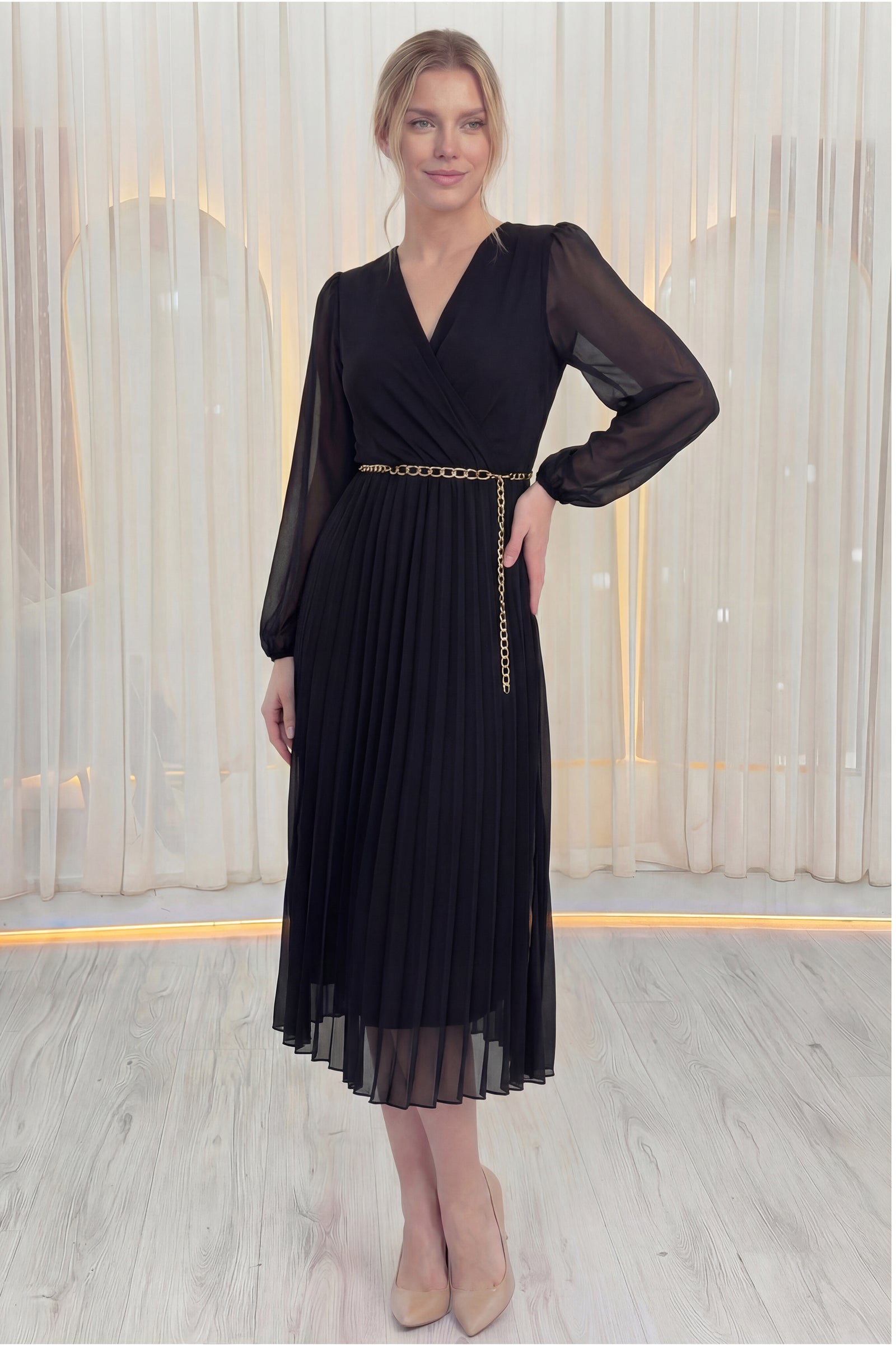 Siyah Kruvaze Yaka Piliseli Kemerli Midi Boy Elbise