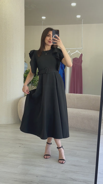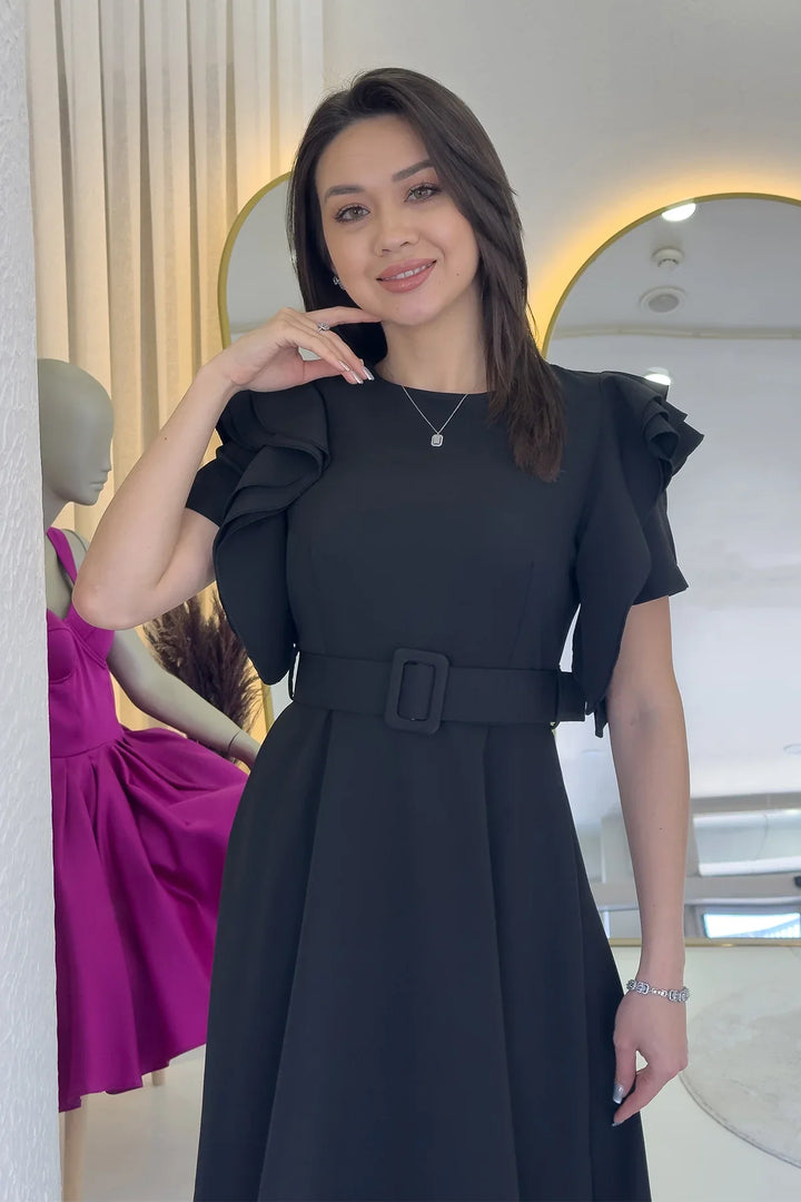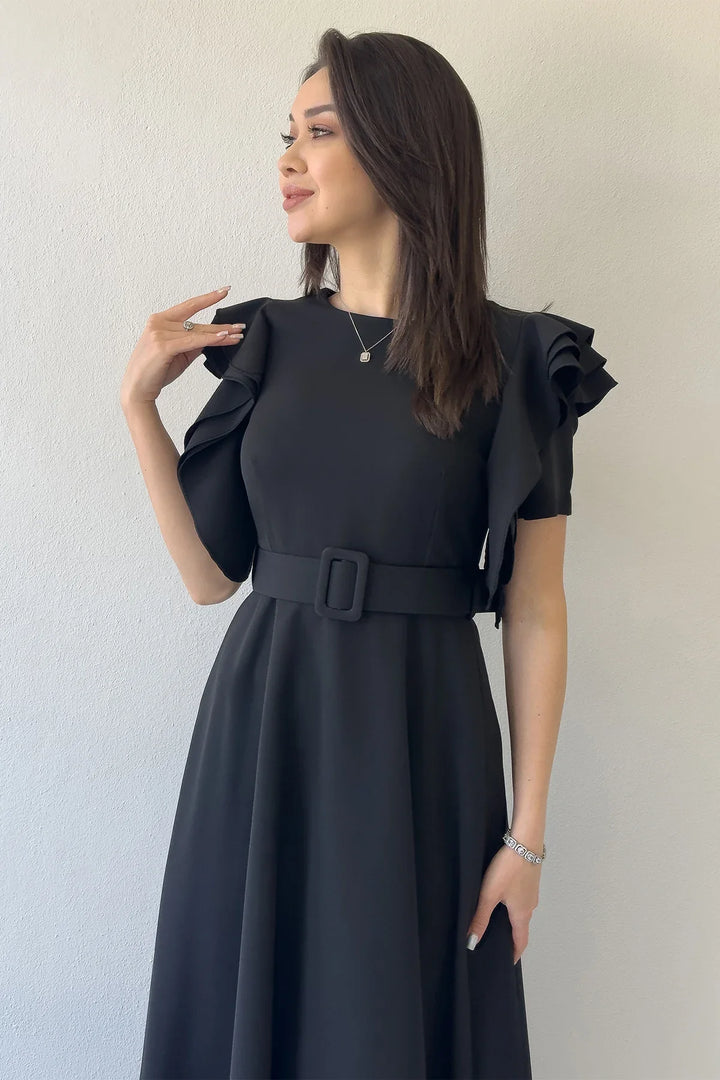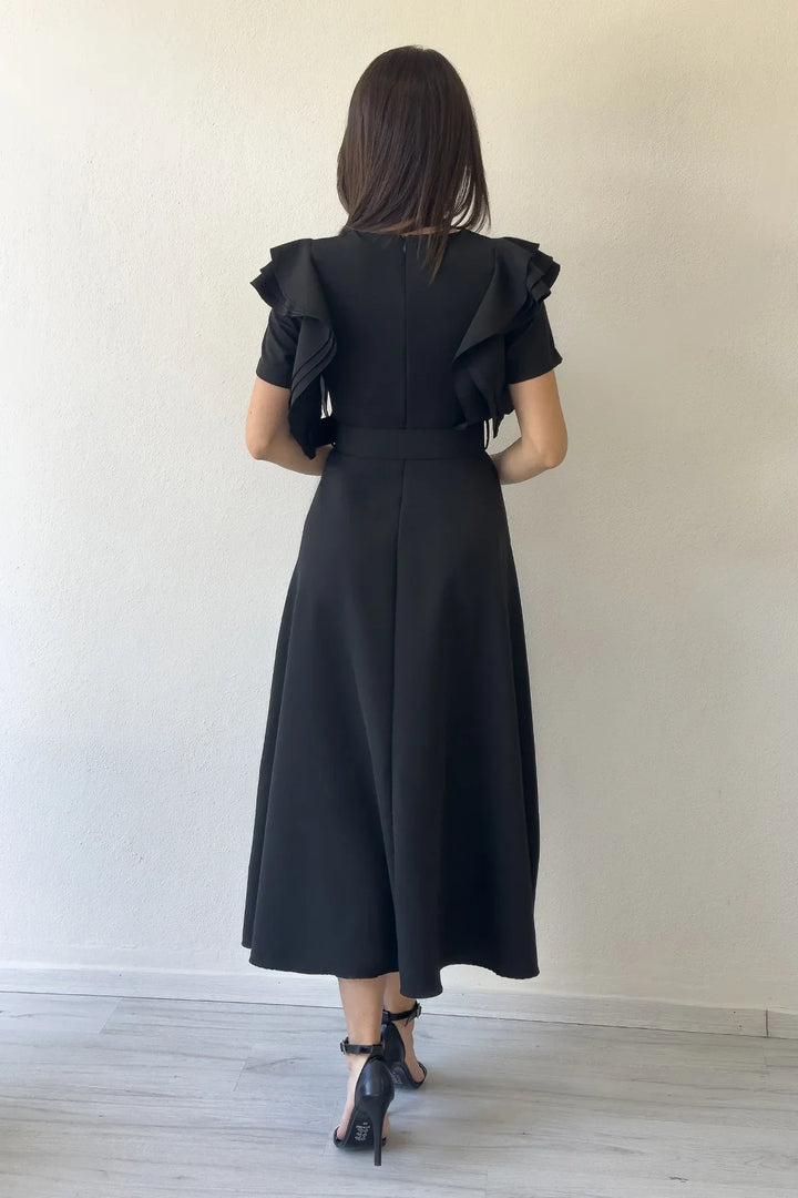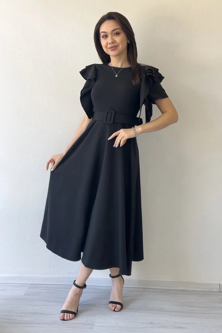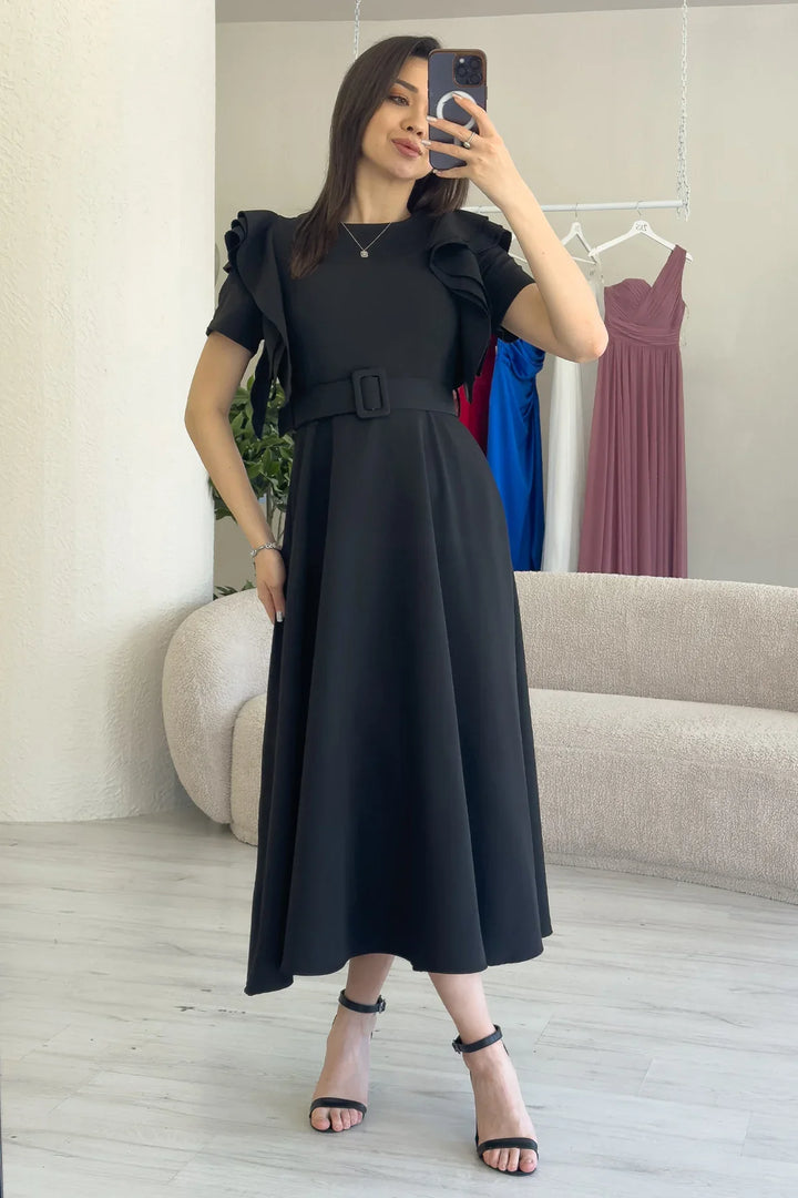 Siyah Omuz Fırfır Detaylı Kemerli Midi Boy Elbise