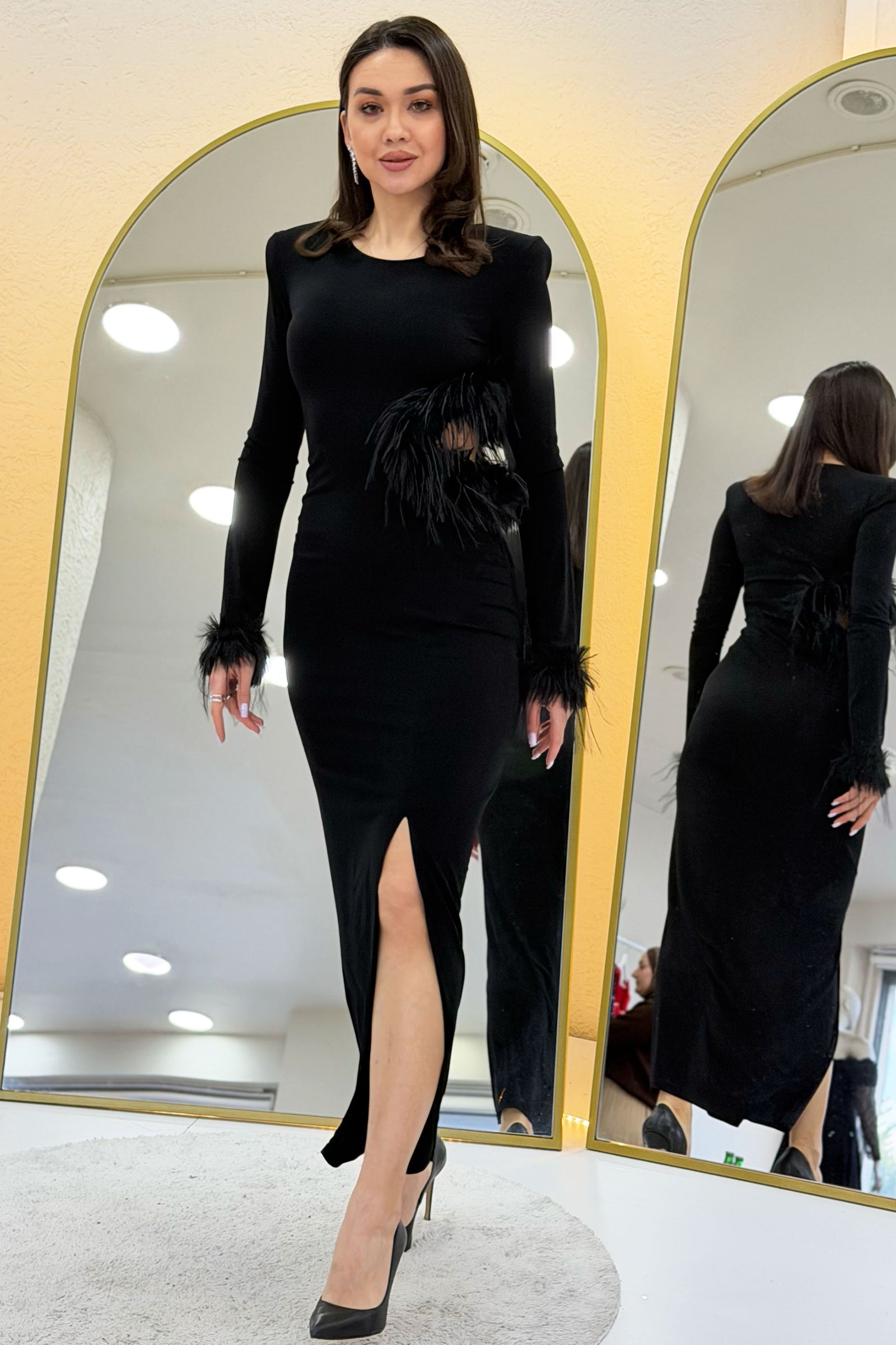 Siyah Otrişli Bel Dekolteli Yırtmaçlı Midi Boy Elbise