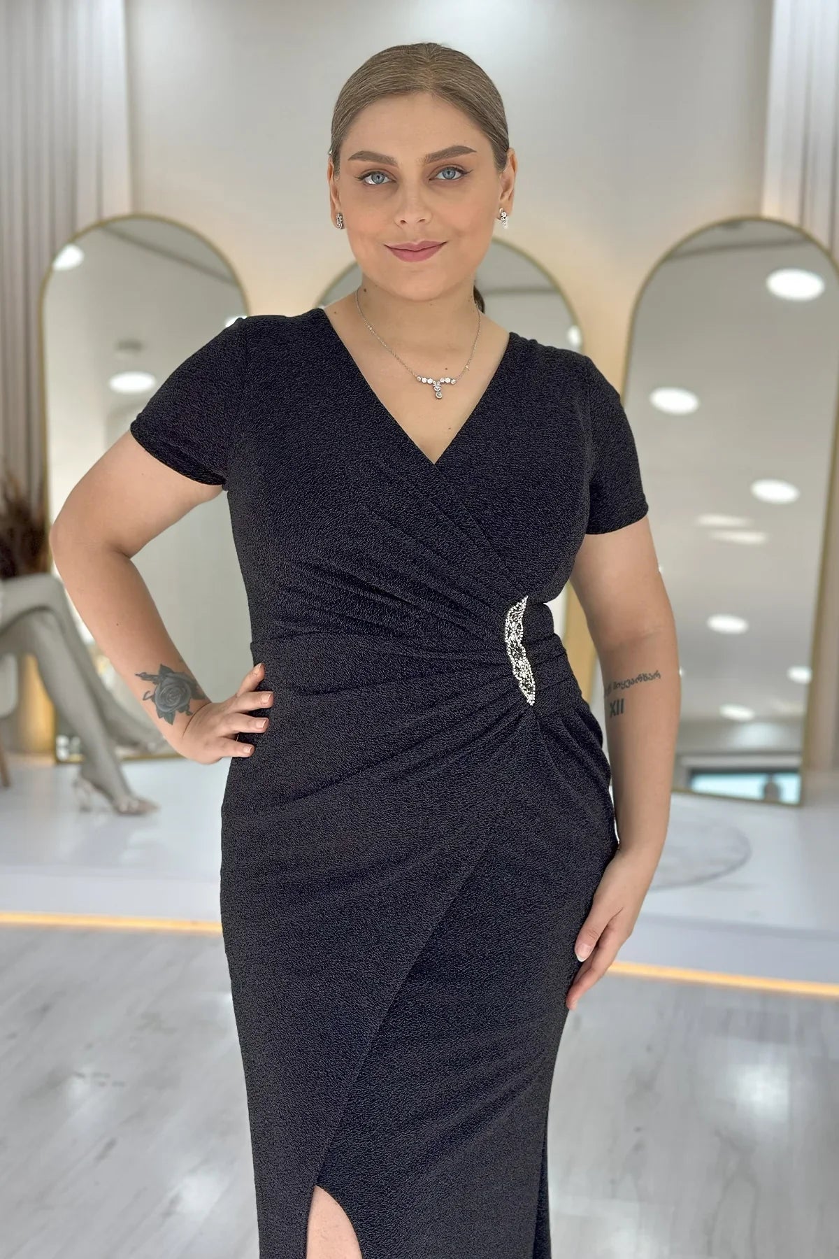 Siyah Simli Kruvaze Yaka Taş Detaylı Büyük Beden Abiye Elbise