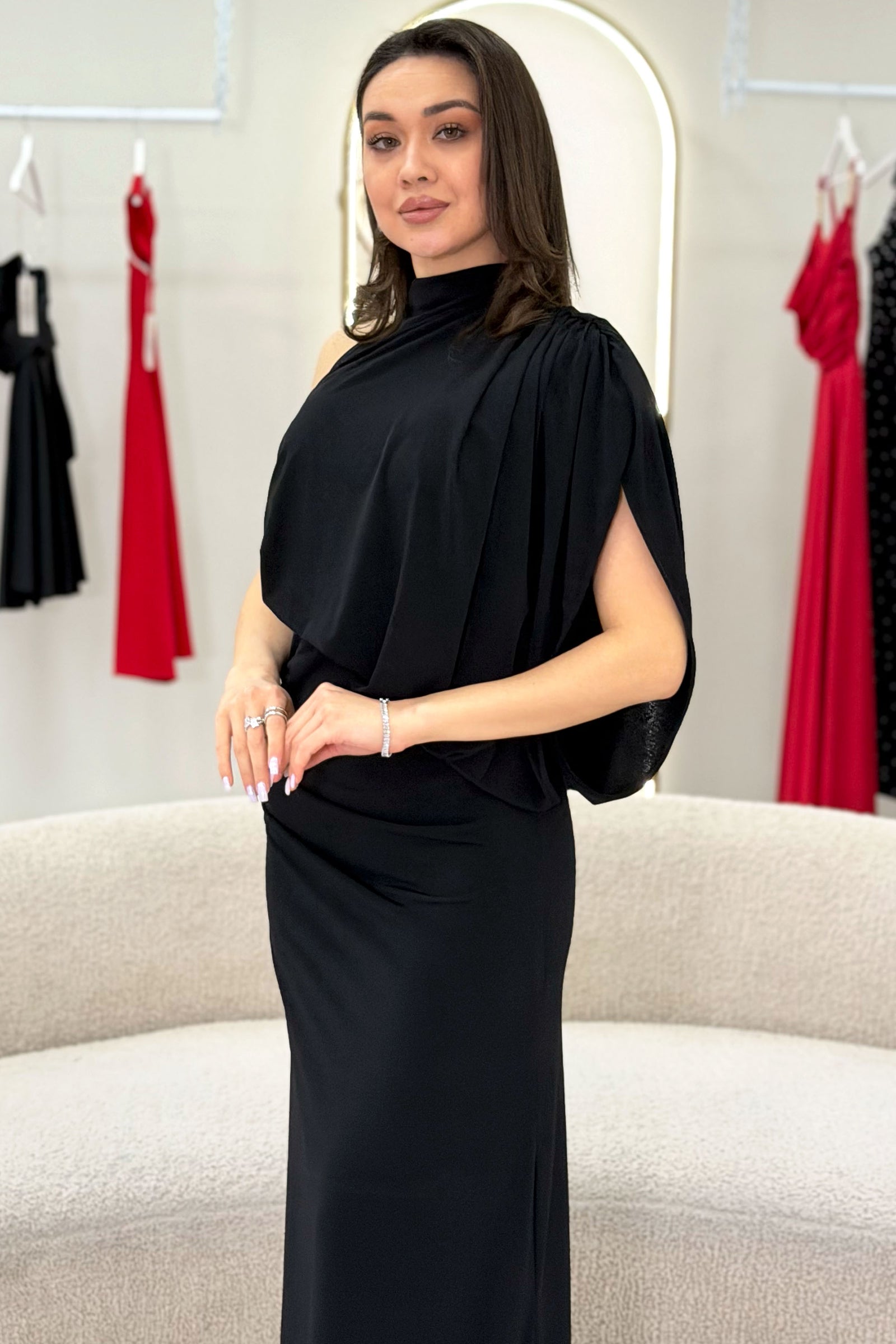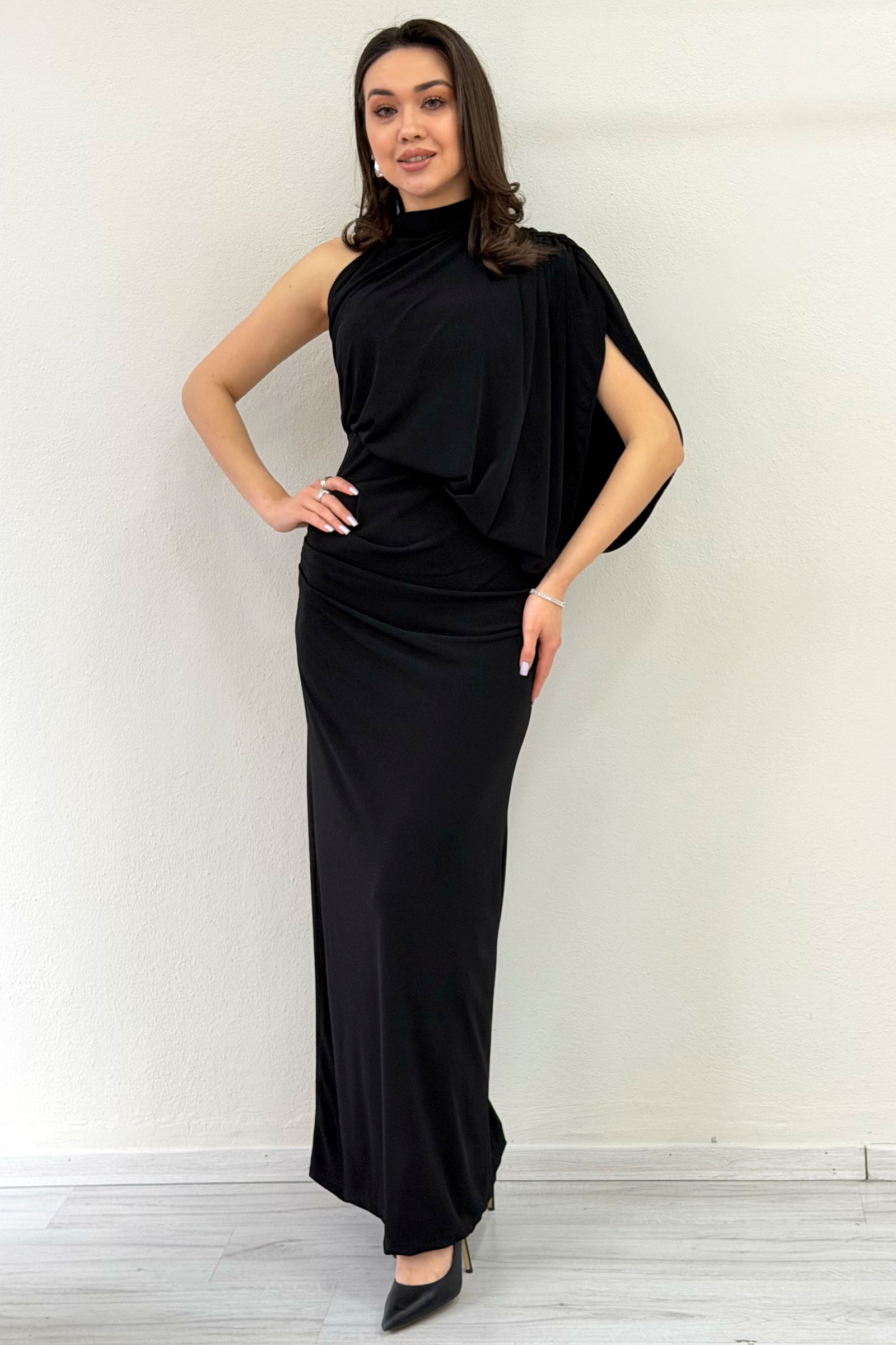 Siyah Tek Omuz Drape Detaylı Asimetrik Uzun Elbise