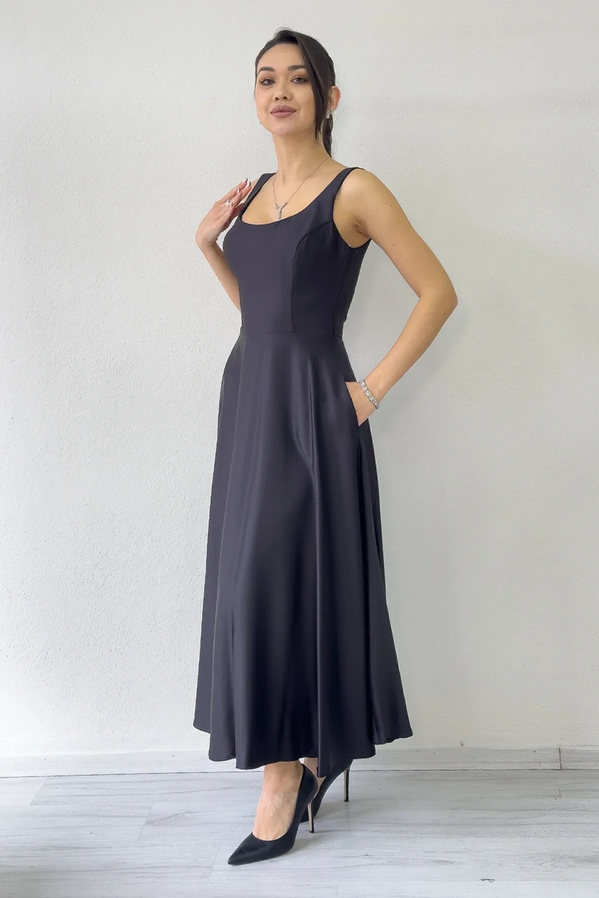 Siyah U Yaka Sırt Bağlamalı Midi Boy Saten Elbise