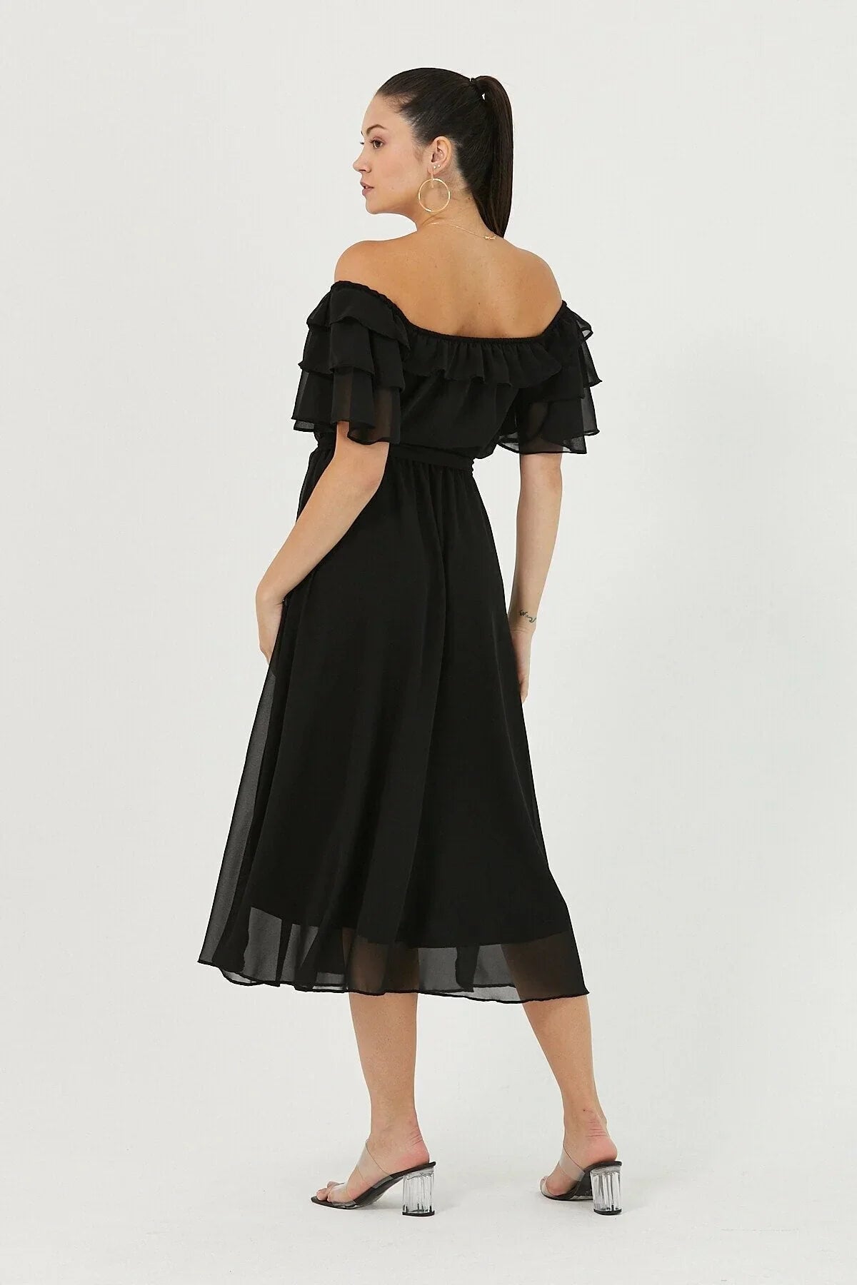 Siyah Volanlı Madonna Yaka Büyük Beden Şifon Elbise