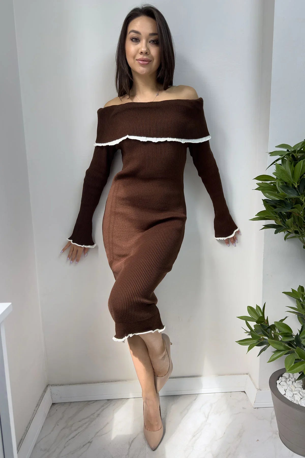 Taba Beyaz Şeritli Carmen Triko Elbise
