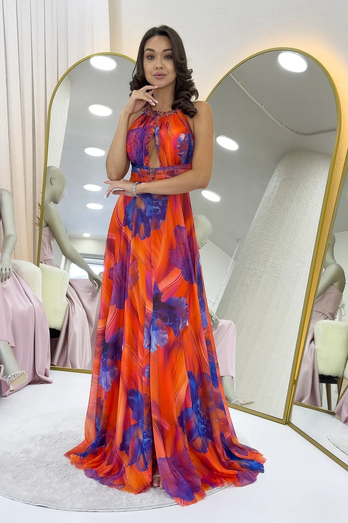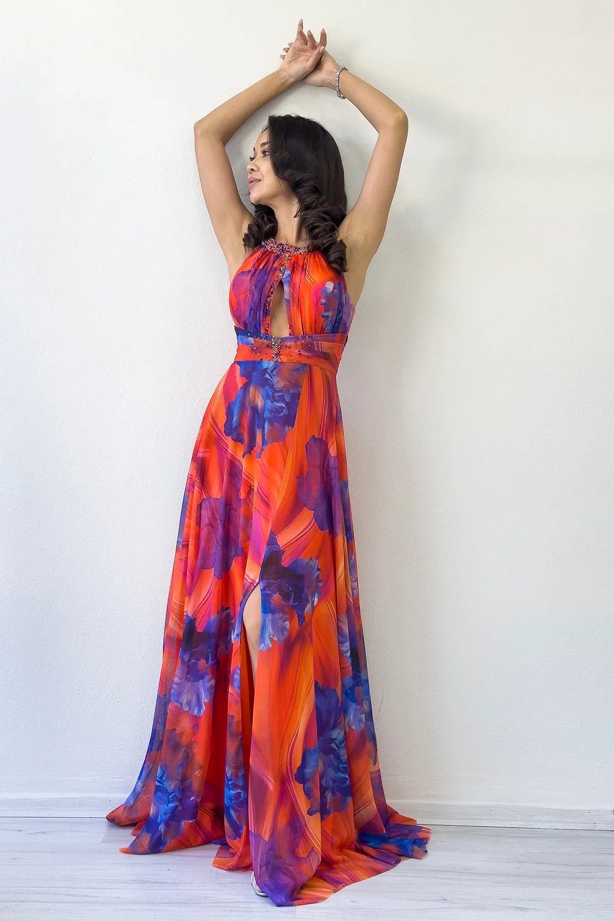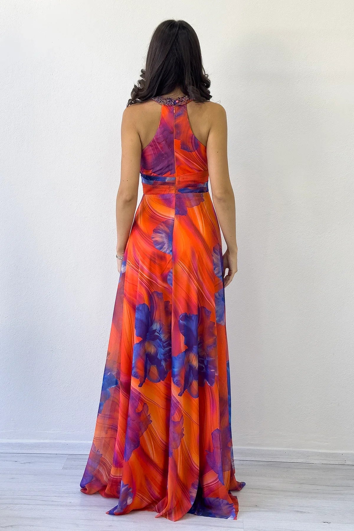 Turuncu Desenli Halter Yaka Boncuk Detaylı Yırtmaçlı Abiye Elbise